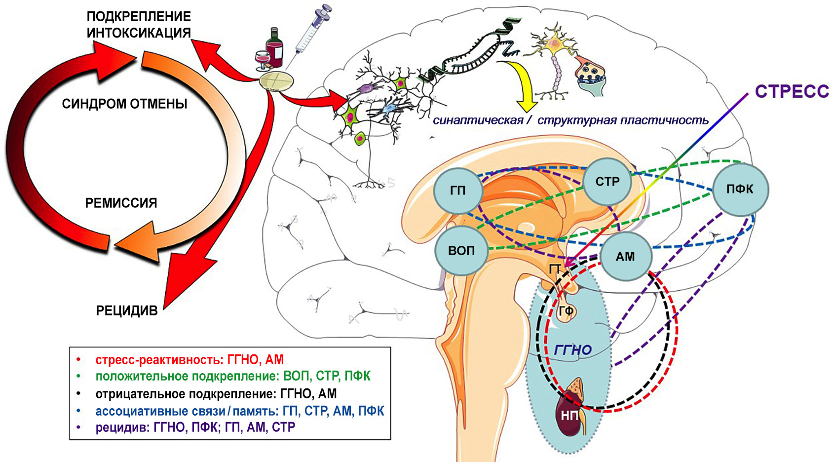 Прекращение поступления ПАВ при сформированной зависимости сопровождается дефицитом положительного подкрепления, развитием болезненного синдрома отмены, который имеет как физиологические проявления, так и выраженный аффективный компонент. Абстинентные расстройства являются дополнительным стрессорным фактором и основой формирования отрицательного подкрепления. Ключевая роль в развитии аффективного компонента абстинентных расстройств отводится амигдале (амигдалярному комплексу) и ГГНО [25]. Исходя из концепции зависимости как аберрантной формы научения и памяти сочетание условных и безусловных стимулов приводит к реконсолидации памяти, что является триггером рецидива. Амигдала, ГП и СТР являются ключевыми структурами этого процесса, а сигнальные каскады, инициируемые дофаминовыми и глутаматными рецепторами, – его молекулярной основой [26]. Рецидив также связывают с ослаблением контроля со стороны ПФК [27]. Нарастание стрессорного влияния, развитие депрессивной симптоматики, которые сопровождаются активацией ГГНО, снижением трофической регуляции и атрофией областей лобной коры являются предикторами рецидива [28]. Череда положительного и отрицательного подкрепления кристаллизует ассоциативные связи зависимости и нарушает гомеостатические механизмы функционирования ЦНС [29]. Таким образом, синдром патологической зависимости от ПАВ – это порочный круг, состоящий из циклов интоксикации и воздержания с вовлечением анатомических субстратов, специфических для каждого акта (рис. 1).