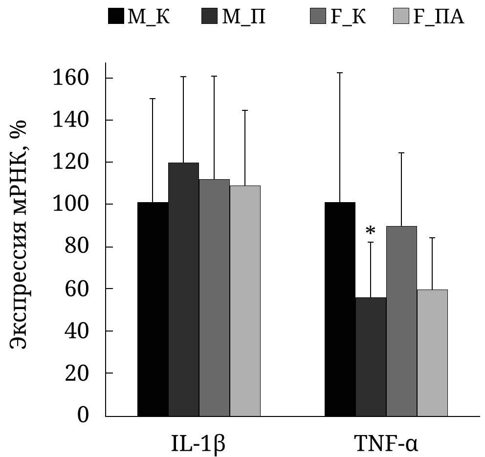 Для выяснения возможных причин снижения содержания TNF-α и IL-1β в префронтальной коре ПА самцов было проведено параллельное изучение экспрессии мРНК TNF-α и IL-1β.