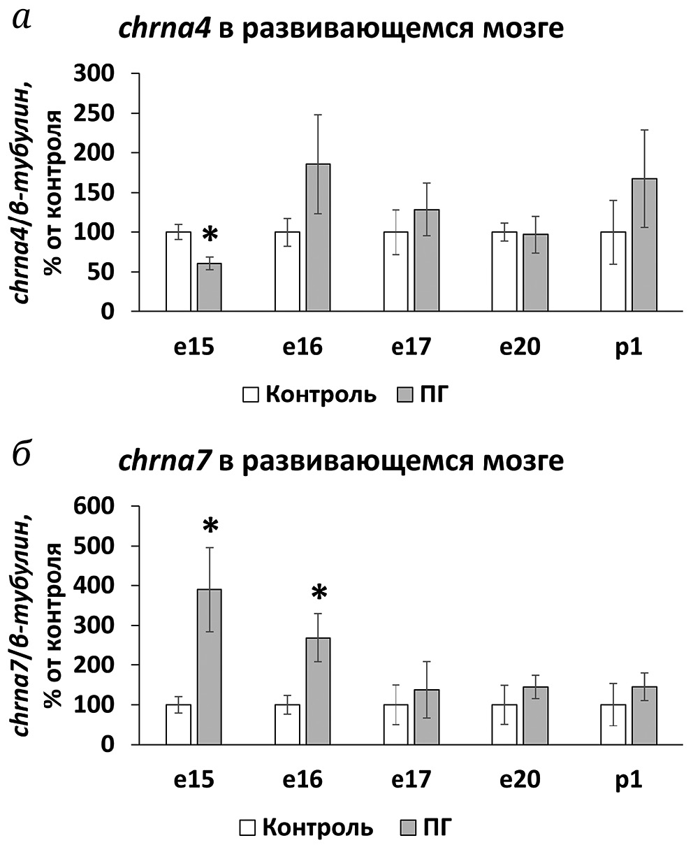 Рис. 2. Влияние ПГ на уровни экспрессии мРНК chrna4 (а) и chrna7 (б) в головном мозге крыс во время пренатального (эмбриональные дни e15, e16, e17, e20) и раннего постнатального (постнатальный день p1) развития, выявленное с помощью ПЦР РВ. * Различия по сравнению с контролем достоверны, p < 0,05 (однофакторный дисперсионный анализ, тест Тьюки). n = 5
