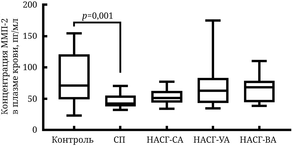 Рис. 1. Концентрация ММП-2 в плазме крови пациентов с НАЖБП и в контрольной группе. Данные представлены в виде: Q1–Q3, медиана, минимум, максимум. Указаны значения p, согласно U-критерию Манна–Уитни с поправкой Бонферрони