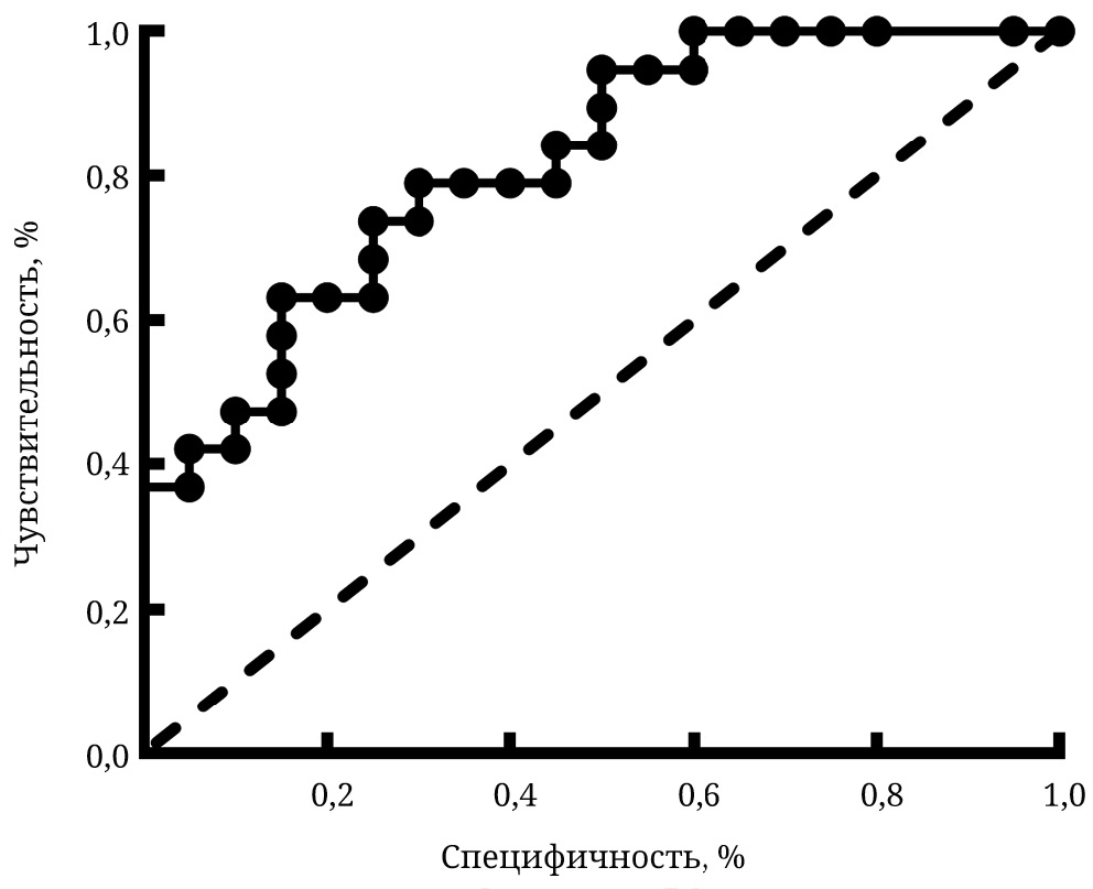 Статистический анализ проведен с использованием программы GraphPad Prism v.7. Значения р < 0,05 рассматривались как статистически значимые. Проводили тест на соответствие результатов нормальному распределению (с помощью критерия W Шапиро–Уилка). В связи с несоответствием распределений показателей в группах нормальному использовали непараметрические критерии для анализа. При сравнении изучаемых показателей в группах использовали критерий H Краскела–Уоллиса с последующим парным сравнением групп с помощью критерия U Вилкоксона–Манна–Уитни с применением поправки Бонферрони при оценке значения p. Взаимосвязь показателей оценивали с помощью расчета рангового коэффициента корреляции Спирмена (rs). Для оценки силы связи между двумя величинами использовали шкалу Чеддока, согласно которой значения rs от 0,1 до 0,3 соответствуют слабой взаимосвязи, 0,3–0,5 – умеренной, 0,5–0,7 – заметной, 0,7–0,9 – высокой, более 0,9 – весьма высокой. Анализ ROC-кривых проводили по вычислению значений площадей под кривыми (AUC), оптимальный порог отсечения определяли в соответствии с максимальным индексом Юдена [91, 92].