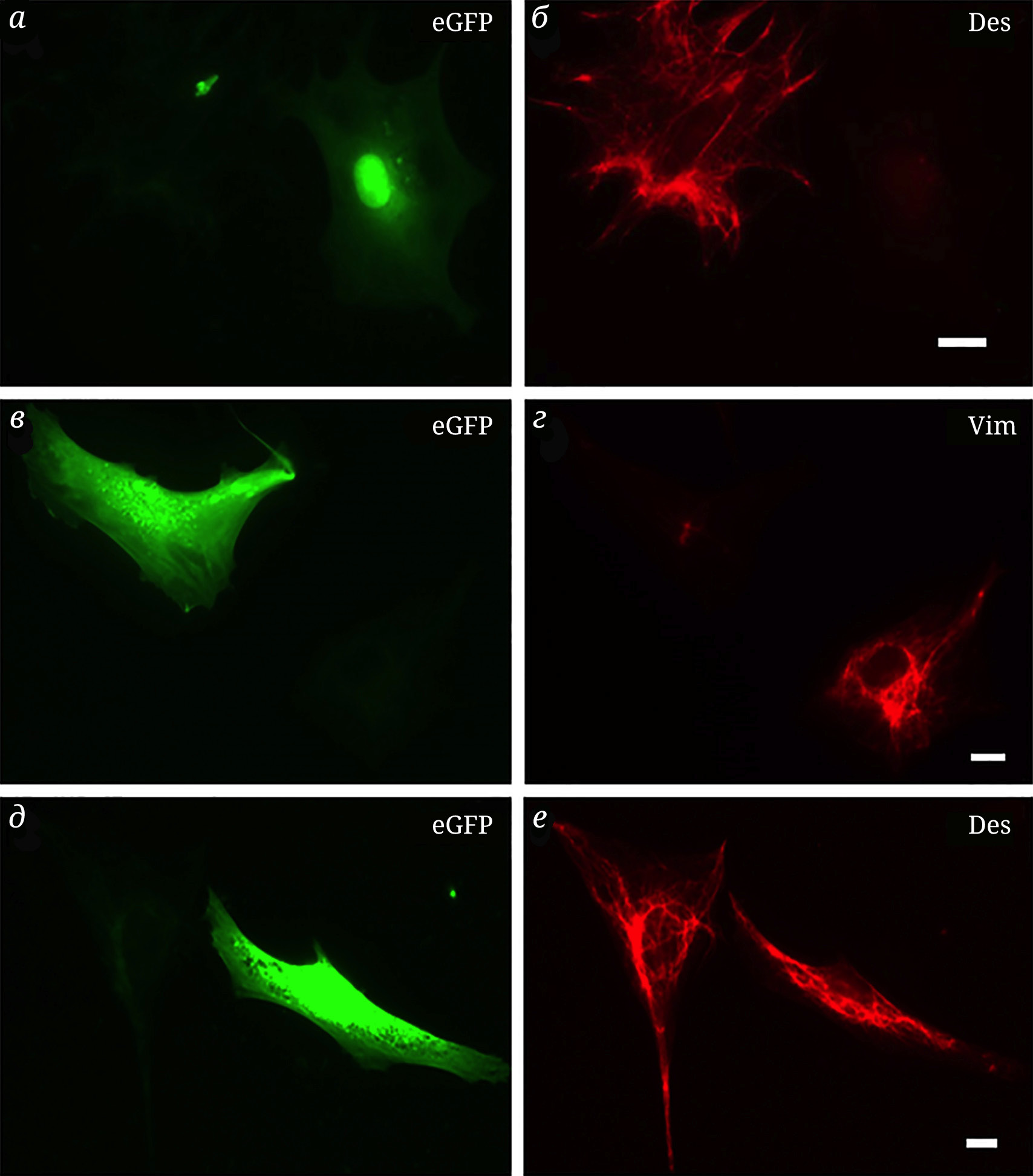 Рис. 2. Разрушение десминовых (а, б) и виментиновых (в, г) ПФ при помощи РНК-интерференции в клетках ВНК21, трансфицированных плазмидами pG-SHIN2-des и pG-SHIN2-vim соответственно. Контрольные клетки (д, е) трансфицировали плазмидой pG-SHIN2-scr. ПФ окрашены при помощи антител против десмина (Des) и виментина (Vim). Трансфицированные клетки выявляли по экспрессии GFP. Масштаб 10 мкм