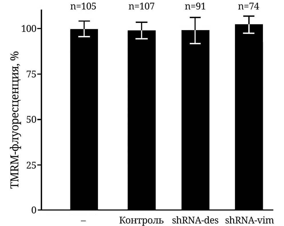 Рис. 3. Отсутствие изменений мембранного потенциала митохондрий в клетках ВНК21 после нокдауна десмина (shRNA-des) и виментина (shRNA-vim) при помощи РНК-интерференции. Контрольные клетки трансфицировали плазмидой pG-SHIN2-scr. Данные представлены в виде средних значений флуоресценции митохондрий в указанном числе клеток со стандартной ошибкой в процентах от среднего значения в нетрансфицированных клетках (–)