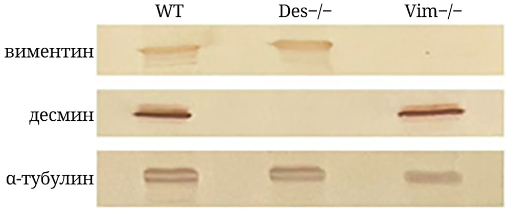 Рис. 4. Иммуноблоттинг гомогенатов клеток исходной линии ВНК21 (WT) и линий ВНК21(Des−/−) и ВНК21(Vim−/−), полученных в результате нокаута генов десмина и виментина соответственно. Альфа-тубулин использовали как контроль