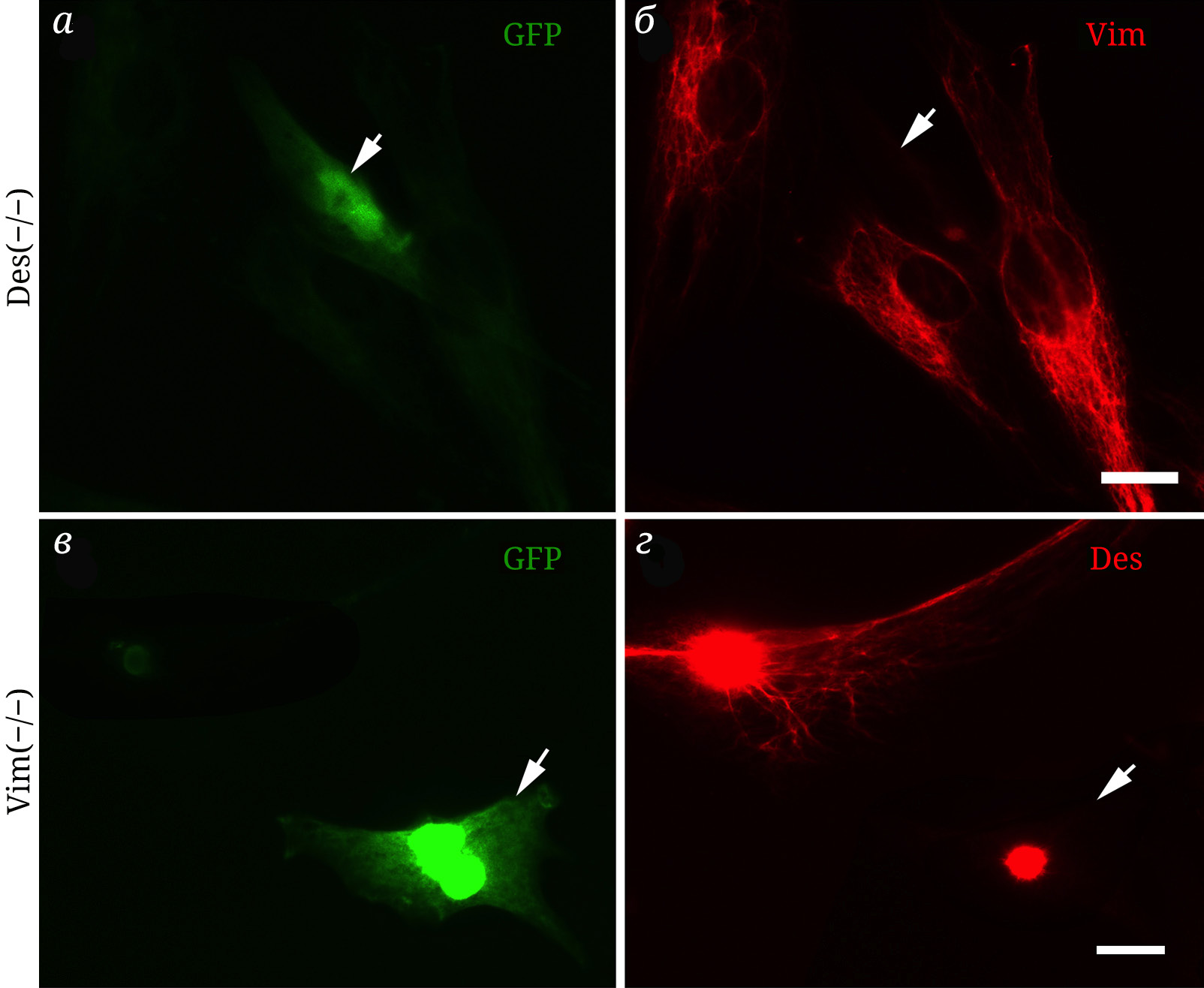 Рис. 6. Удаление виментина (а, б) в клетках ВНК21(Des−/−) и десмина (в, г) в клетках ВНК21(Vim−/−), трансфицированных плазмидами pG-SHIN2-vim и pG-SHIN2-des соответственно, при помощи РНК-интерференции. ПФ окрашены при помощи антител против виментина (б) и десмина (г). Трансфицированные клетки выявляли по экспрессии GFP (а, в, показаны стрелками). Масштаб 10 мкм