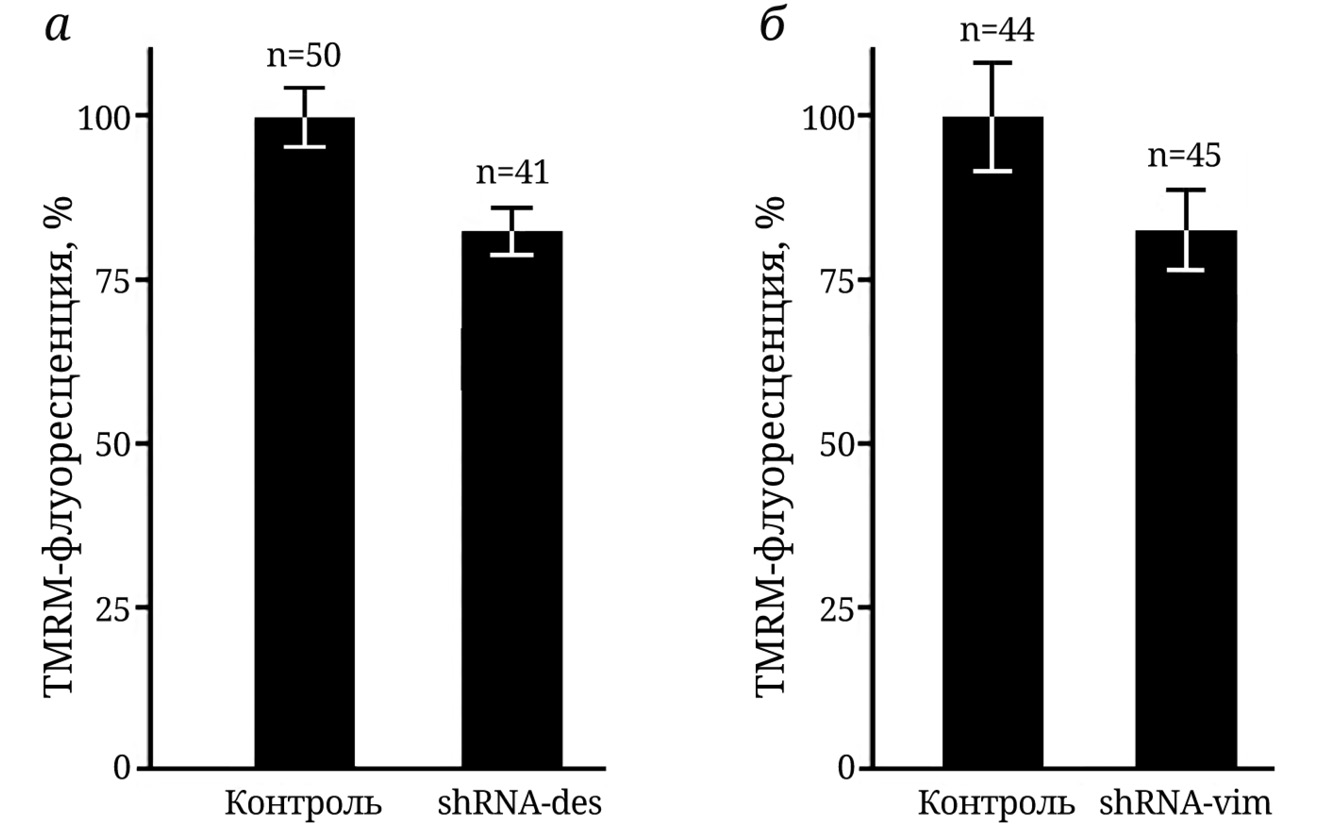 Рис. 7. Снижение мембранного потенциала митохондрий в клетках ВНК21(Vim−/−) (а) и в клетках ВНК21(Des−/−) (б) в результате РНК-интерференции десмина или виментина соответственно. В качестве контроля использовали клетки, трансфицированные плазмидой pG-SHIN2-scr. Данные представлены в виде средних значений флуоресценции митохондрий в указанном числе клеток со стандартной ошибкой в процентах от среднего значения в нетрансфицированных клетках