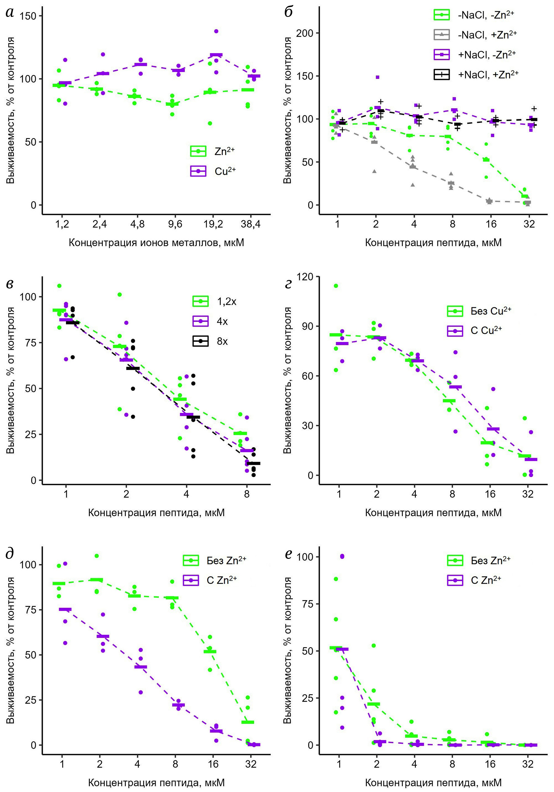 Рис. 4. Антимикробная активность C3f и его аналогов в отношении L. monocytogenes при отсутствии и в присутствии ионов металлов. а – Выживаемость бактерий в присутствии Zn2+ и Cu2+; б – действие C3f в зависимости от присутствия Zn2+ и 0,15 М NaCl; в – действие C3f при различном молярном избытке Zn2+; г – действие C3f в зависимости от присутствия Cu2+; д и е – действие C3f[H/S] и C3f[H/K] при отсутствии и в присутствии Zn2+