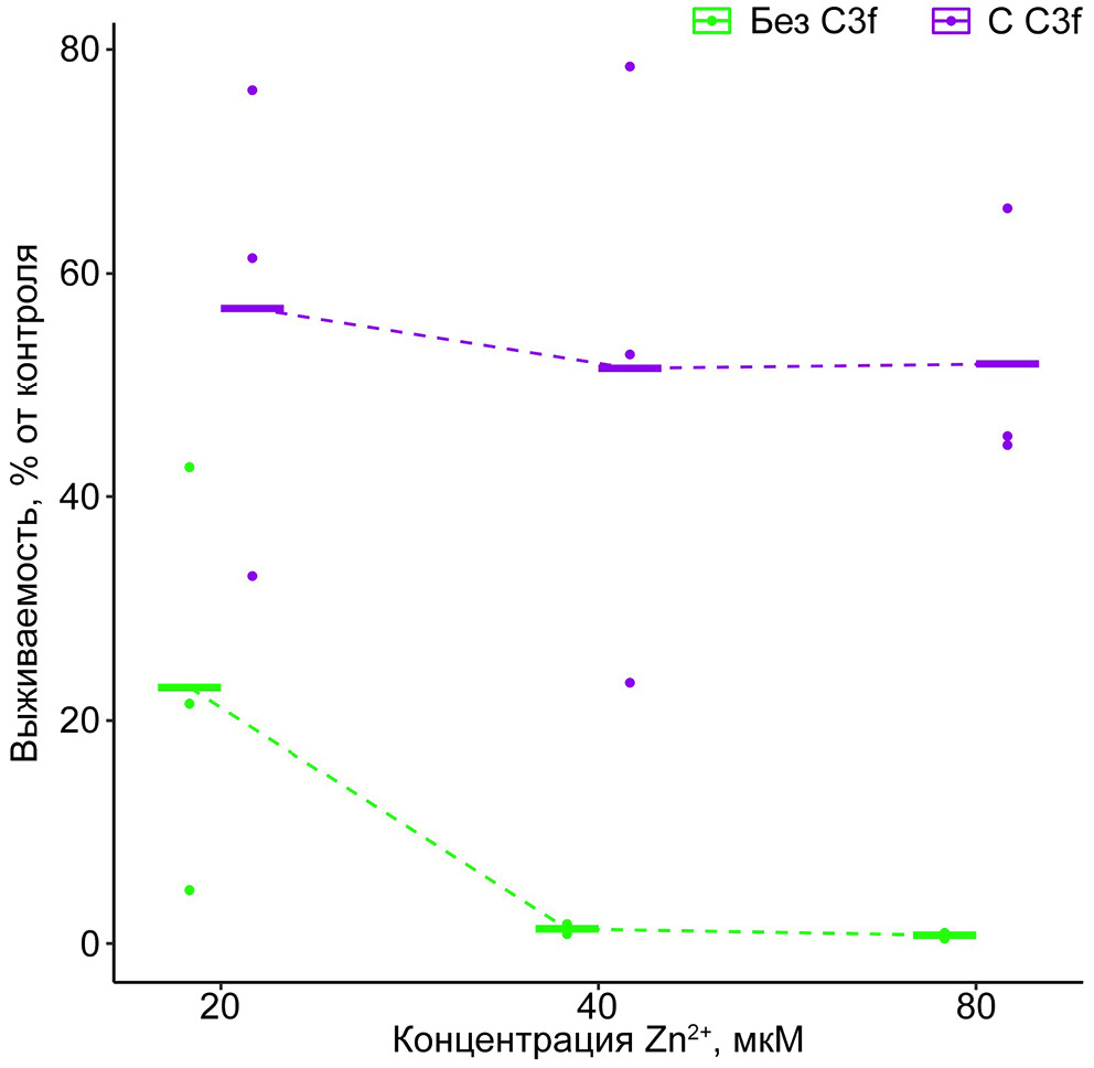 Бактерия E. coli ESBL 521/17, так же как M. luteus, St. aureus и Ps. aeruginosa, проявляет чувствительность к ионам цинка, но при этом она устойчива к действию самого C3f. ZnCl2 в концентрациях 20–80 мкМ приводил к выраженному снижению выживаемости бактерии, однако присутствие C3f противостояло этому эффекту (рис. 5).