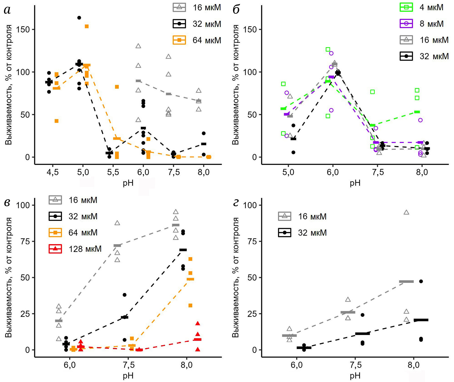 Рис. 6. Антимикробная активность пептидов при различных значениях pH. а – Действие C3f в отношении L. monocytogenes; б – действие HNP в отношении L. monocytogenes; в и г – действие C3f и C3f[H/K] в отношении M. luteus