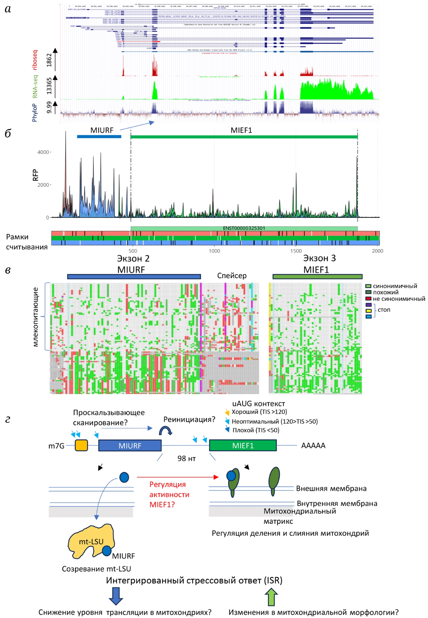 Рис. 3. MIURF–MIEF1. а – Данные Riboseq и RNAseq для гена MIEF1, полученные с помощью геномного браузера GWIPS-Viz [24]. Эволюционная консервативность нуклеотидов у 100 позвоночных показана как сигнал PhyloP (phyloP100way) [25]. б – Данные Riboseq из транскриптомного браузера Ribocrypt (ribocrypt.org, подготавливается к публикации), рибосомные футпринты окрашены в цвета, соответствующие трём открытым рамкам считывания, показаны внизу диаграммы. в – Множественное выравнивание последовательности, проведённое с помощью CodAlignView («CodAlignView: a tool for exploring signatures of protein-coding evolution in an alignment», I. Jungreis, M. Lin, M. Kellis, in preparation), использован набор выравниваний hg30_100. г – Схематическое представление бицистронной мРНК MIURF-MIEF1. AUG-кодоны, расположенные перед вторым цистроном, отмечены цветными стрелками. Функциональная роль соответствующих белковых продуктов показана на схеме внизу