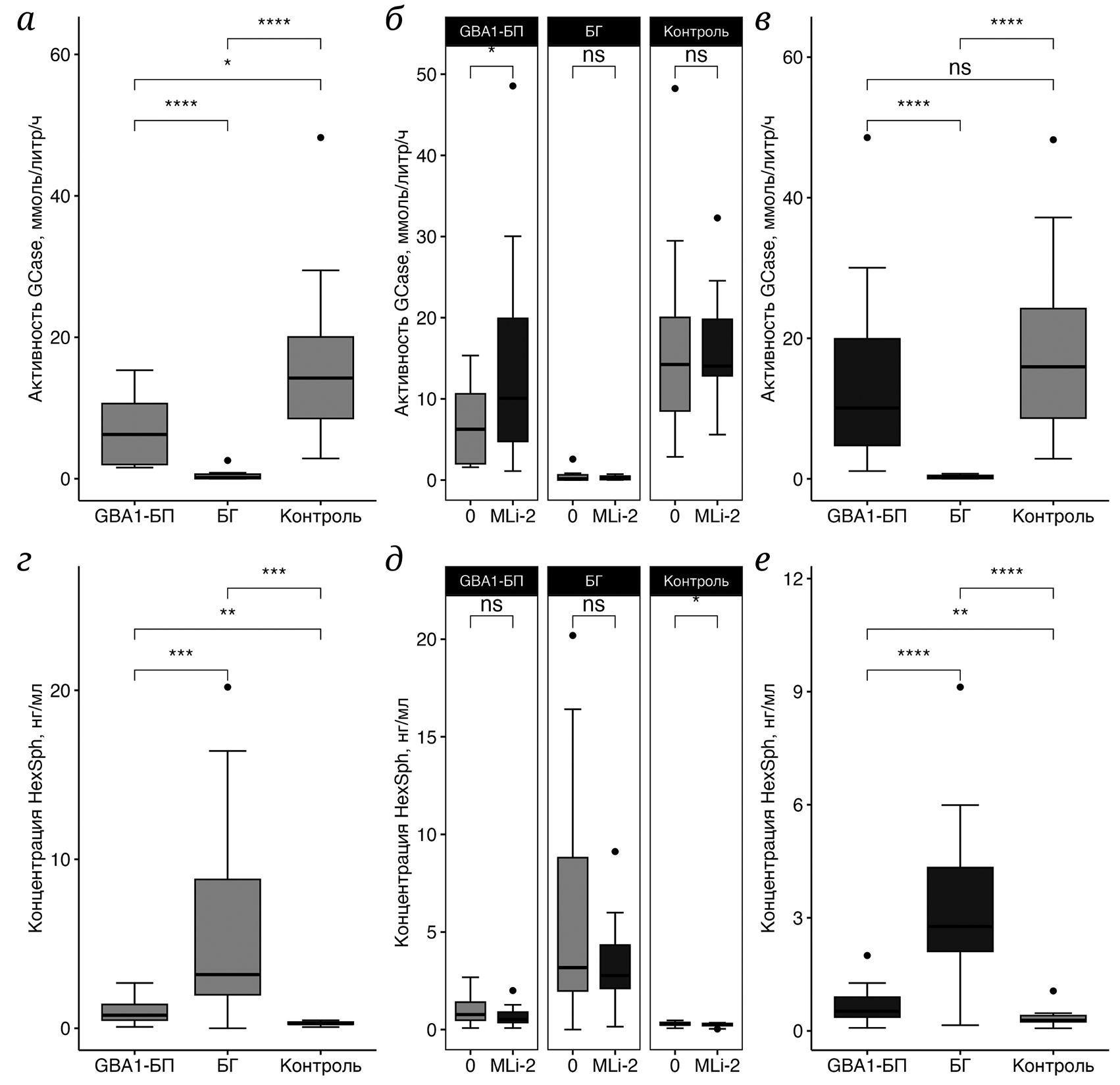 Рис. 1. Уровень активности GCase и HexSph в первичной культуре макрофагов периферической крови пациентов с БГ, GBA1-БП и контроля. а – Активность GCase в первичной культуре макрофагов периферической крови исследуемых групп; б – активность GCase в первичной культуре макрофагов периферической крови исследуемых групп при культивировании в присутствии и без ингибитора киназной активности LRRK2; в – активность GCase в первичной культуре макрофагов периферической крови пациентов с GBA1-БП и БГ при культивировании в присутствии киназной активности LRRK2 и контроля без ингибитора киназной активности LRRK2; г – концентрация HexSph в первичной культуре макрофагов периферической крови исследуемых групп; д – концентрация HexSph в первичной культуре макрофагов периферической крови исследуемых групп при культивировании в присутствии и без ингибитора киназной активности LRRK2; е – концентрация HexSph в первичной культуре макрофагов периферической крови пациентов с GBA1-БП и БГ при культивировании в присутствии киназной активности LRRK2 и контроля без ингибитора киназной активности LRRK2. * p < 0,05; ** p < 0,01; *** p < 0,001; **** p < 0,0001; ns – нет статистической значимости
