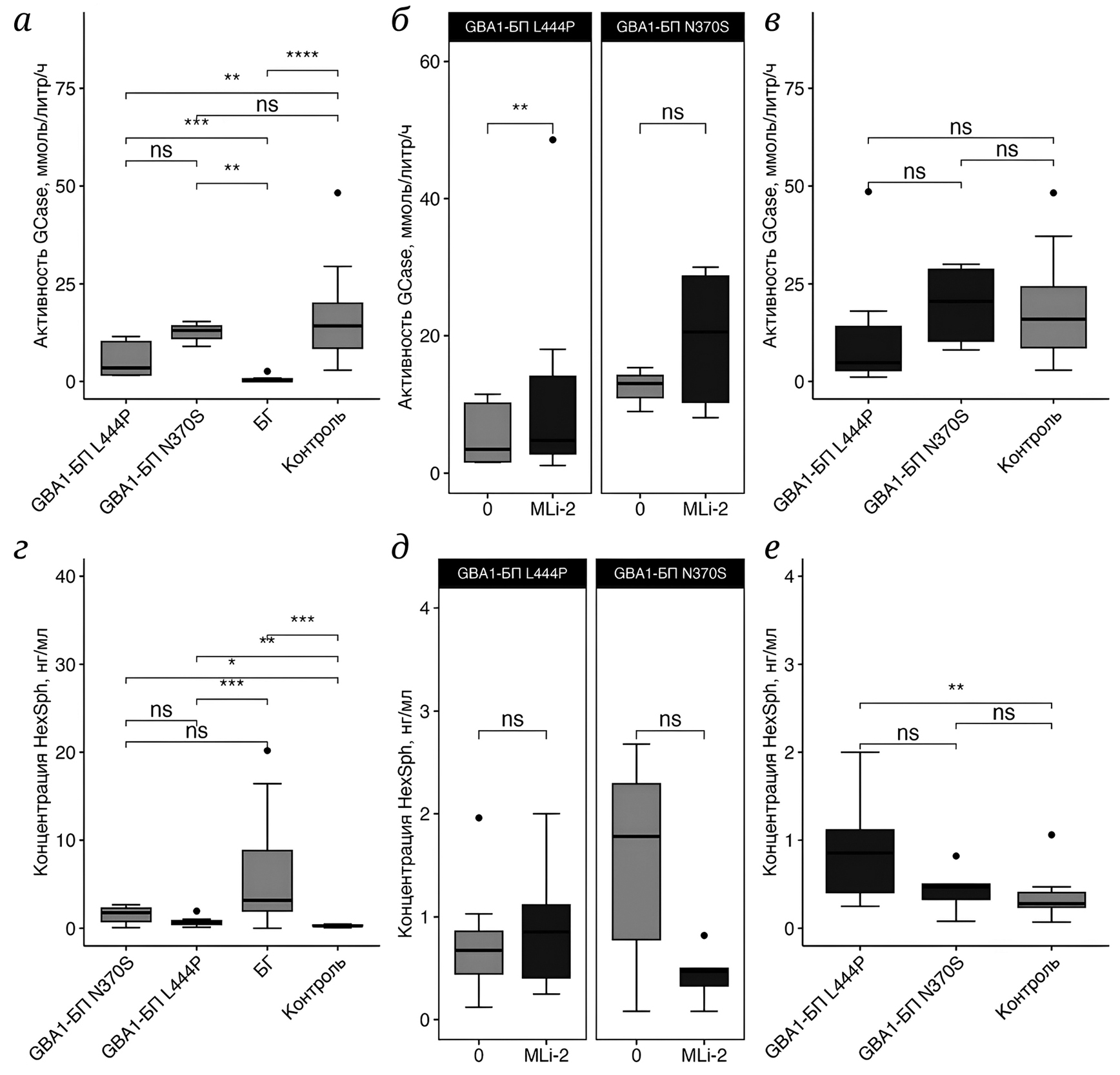 Рис. 2. Уровень активности GCase и HexSph в первичной культуре макрофагов периферической крови пациентов с БГ, GBA1-БП и контроля в зависимости от мутаций в гене GBA1 в группе пациентов с GBA1-БП. а – Активность GCase в первичной культуре макрофагов периферической крови исследуемых групп; б – активность GCase в первичной культуре макрофагов периферической крови исследуемых групп при культивировании в присутствии и без ингибитора киназной активности LRRK2; в – активность GCase в первичной культуре макрофагов периферической крови пациентов с GBA1-БП и БГ при культивировании в присутствии киназной активности LRRK2 и контроля без ингибитора киназной активности LRRK2; г – концентрация HexSph в первичной культуре макрофагов периферической крови исследуемых групп; д – концентрация HexSph в первичной культуре макрофагов периферической крови исследуемых групп при культивировании в присутствии и без ингибитора киназной активности LRRK2; е – концентрация HexSph в первичной культуре макрофагов периферической крови пациентов с GBA1-БП и БГ при культивировании в присутствии киназной активности LRRK2 и контроля без ингибитора киназной активности LRRK2. * p < 0,05; ** p < 0,01; *** p < 0,001; **** p < 0,0001; ns – нет статистической значимости