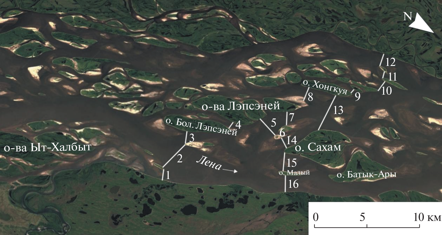 The first full morphological–hydrological characteristic is given to complex parallel-branch bifurcations of the lower Lena, which have formed at the total (taken with islands) channel width in individual links from 12.6 to 28 km and their length from 36 to 45 km. The number of islands in the branching links is 29 in the Upper Monastyrskii and more than 40 in the Cherpalskii bifurcations. It is shown that, all over the length, two branches with largest water abundance can be identified—the left and the right—of which the latter, navigable in all links and more abundant in water, runs along or near the right, bedrock bank. The left branch concentrates the runoff of water and sediments from the Vilyui, the left tributary of the Lena; this, along with the sediment-removing role, determines its shallowness and higher secondary branching. The links of the branches are separated by short segments of channel narrowing down to 5–8 km, in which two-midstream flow persists. It is shown that groups of islands (archipelagoes) in the middle of the river between the main branches are separated by relatively low-flow central branches subparallel to them (overall, within 10–15% of river flow), numerous transverse channels between islands and divided into into two parts (upstream and downstream) by diagonal branches, through which water partly redistributes between the main branches. It was shown that, at many-year scale and at seasonal runoff variations, the water abundance in the main and subparallel branches is practically constant, while the discharge in diagonal branches varies periodically from 10–15 to 30–35%, depending on channel transformations in the right main branch. This coincides with the periodic redistribution of water discharges, the development and shallowing of channels in secondary branching of the main channel, which lie near the sites of separation of diagonal branches from them. The revealed regularities for the first time give data on the channel regime of parallel-branch bifurcation of the channel of a large river, which is of great importance for the improvement of navigation in the Lower Lena