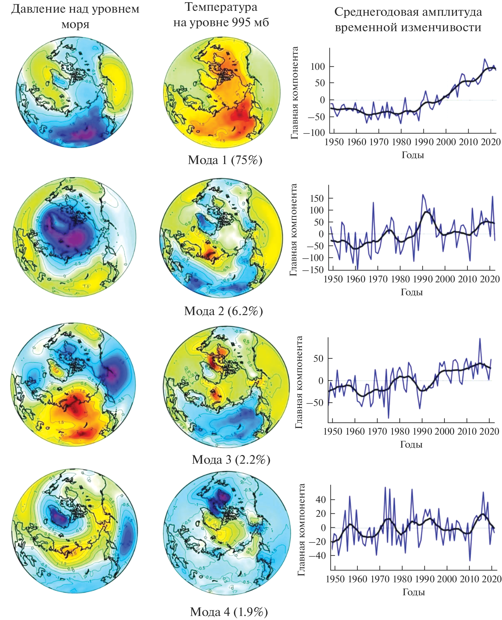 С помощью численного моделирования и данных реанализа исследованы некоторые взаимодействия компонентов климатической системы в Арктике в условиях потепления климата. При анализе данных и результатов численных экспериментов использовался метод разложения полей характеристик состояния среды по естественным ортогональным функциям. Выявлены тенденции изменения атмосферного воздествия на систему океан–лед в период потепления и их связь с тенденциями будущих проекций потепления в рамках наиболее жесткого сценария RCP 8.5 в проекте CMIP-5. Кроме того, с помощью численного моделирования выявлена 44-летняя периодичность в системе взаимодействия общей циркуляции Северного Ледовитого океана и теплосодержания слоя Атлантических вод в нем, которая может быть связана с Атлантической меридиональной опрокидывающей циркуляцией.