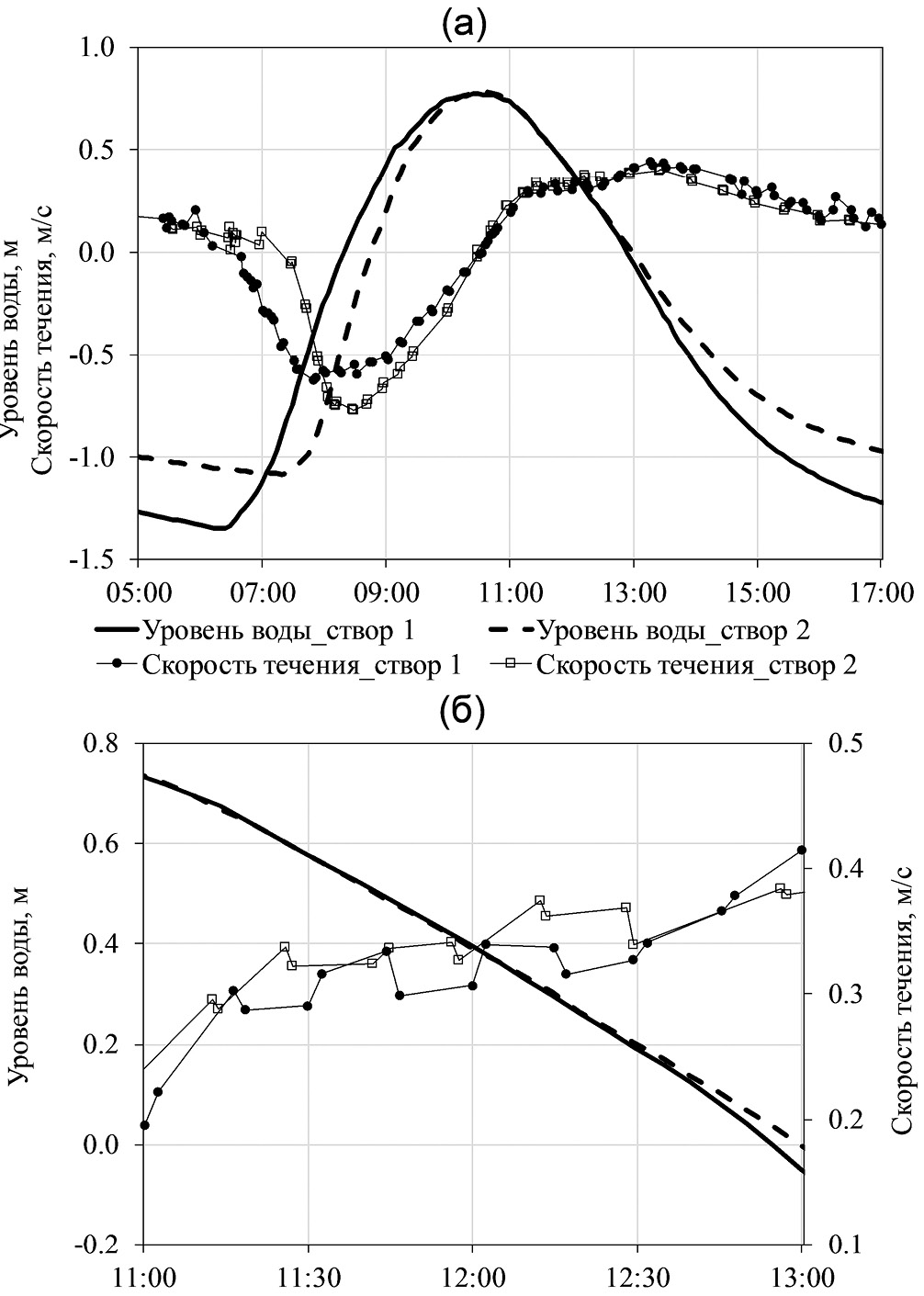 Рис. 4. Изменение средней скорости течения и уровней воды на р. Кянде 04.08.2016: а – в ходе приливного цикла; б – при отливном течении с 11 до 13 ч.