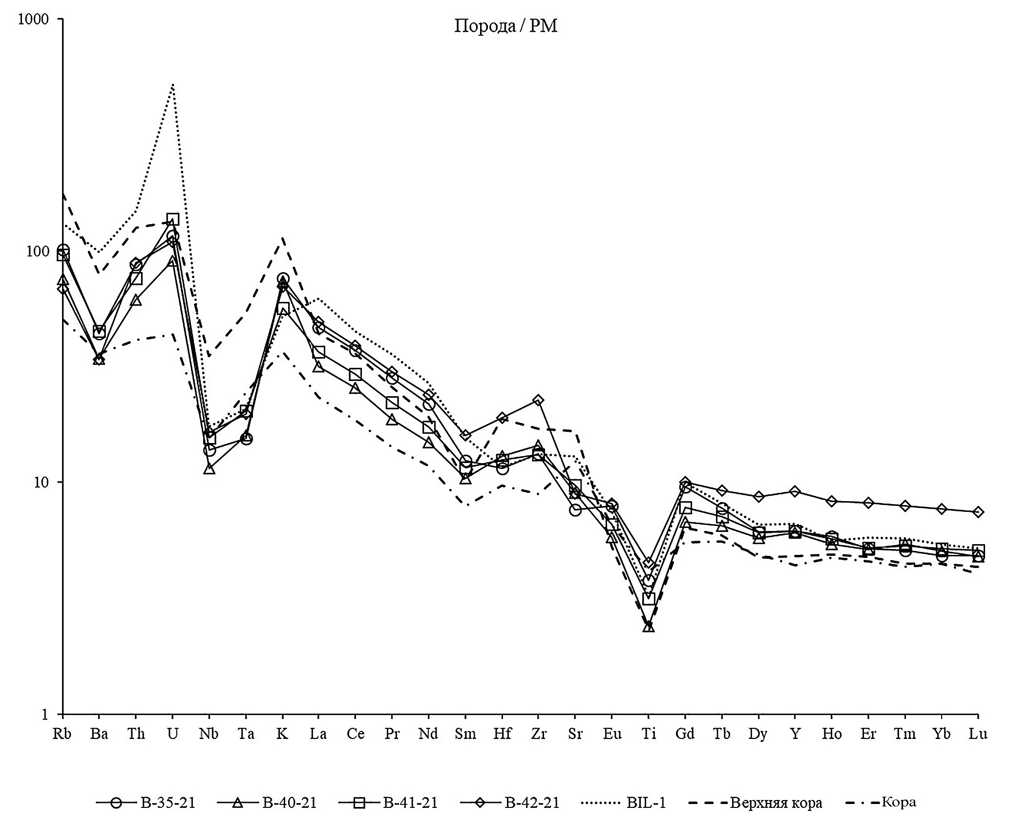 Рис. 2. Распределение редких и редкоземельных элементов в донных илах. В построении диаграммы использованы данные, нормированные по примитивной мантии [29]. В-35–21 – р. Ярлу, верхнее течение; В-40–21 – р. Аккем, исток из грота ледника Аккемского; В-41–21 – оз. Аккем, исток р. Аккем, метеостанция; В-42–21 – р. Текелю, нижнее течение; BIL-1 – байкальский ил (эталонный образец); верхняя кора – верхняя континентальная кора [25]; кора – континентальная кора в целом [25].