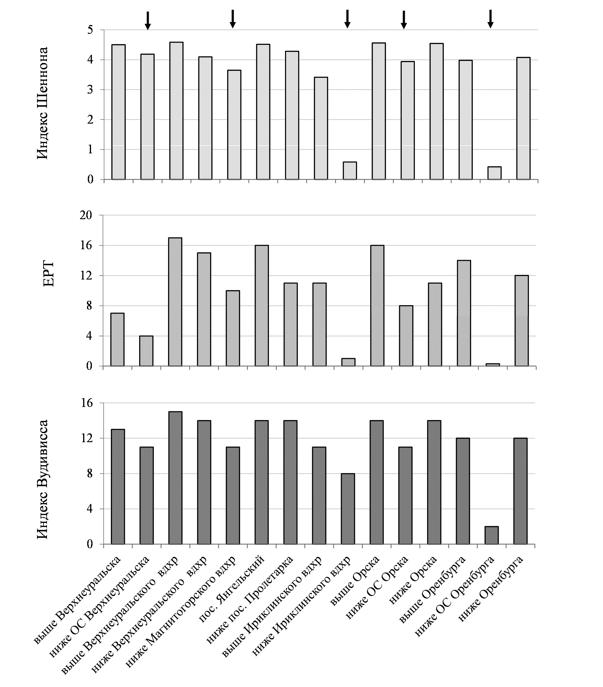 Для оценки загрязненности рек использовали индексы Вудивисса [7, 41], Шеннона (видового разнообразия по численности) [19], ЕРТ (суммарное число видов реофильных беспозвоночных) [24]. При этом считается, что чем больше видовое разнообразие, тем лучше условия существования донных организмов, тем чище вода [2].