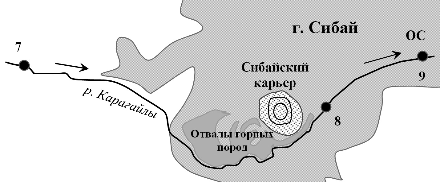 9 | Сброс с ОС г. Сибая | 52.71187 с.ш., 58.71262 в.д. | 1.5 м | 0.15–0.2 | 0.2 | Ил и песок | 17.5 |