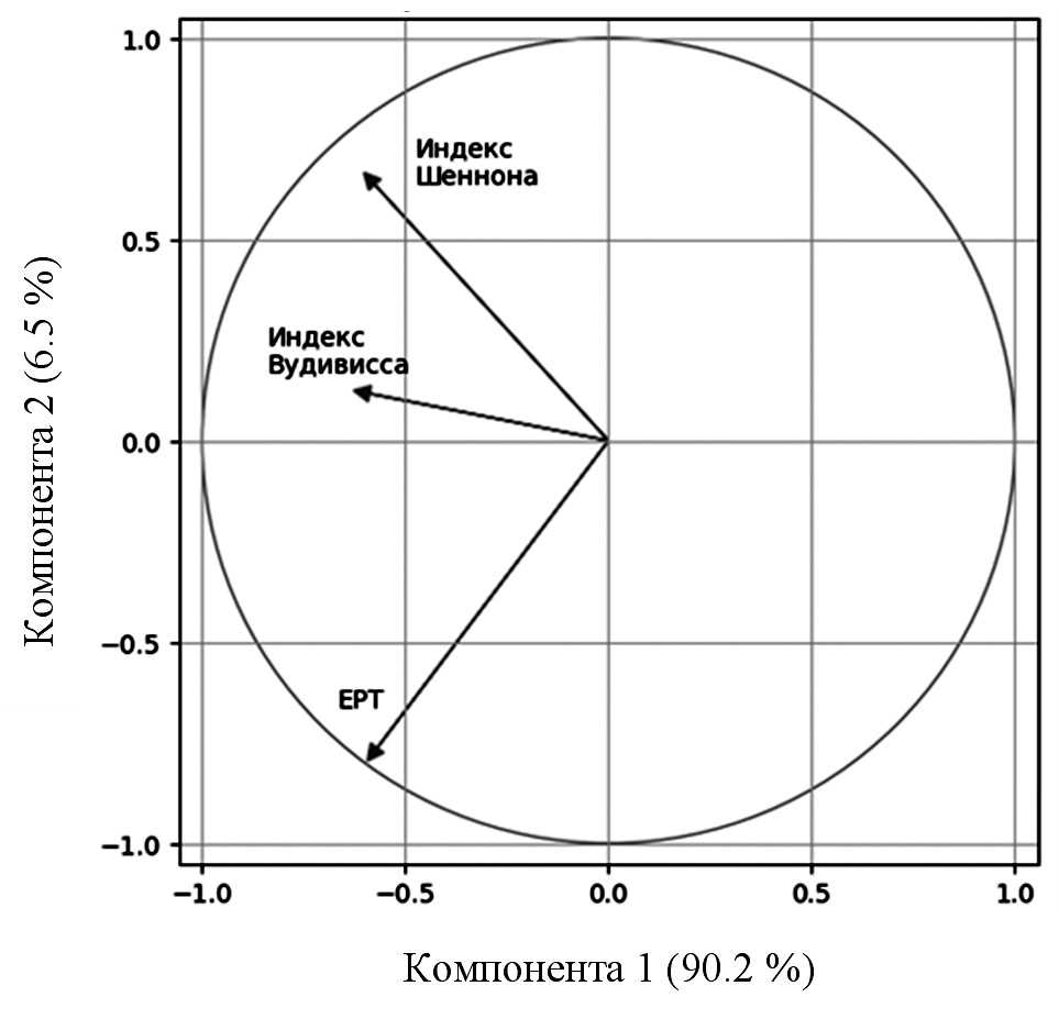 Для однозначной оценки состояния водных объектов индексы Шеннона, Вудивисса и ЕРТ были преобразованы в один комплексный показатель [3, 5]. С этой же целью применен метод главных компонент [38]; в расчетах использована библиотека с открытым исходным кодом Scikit-learn [39].