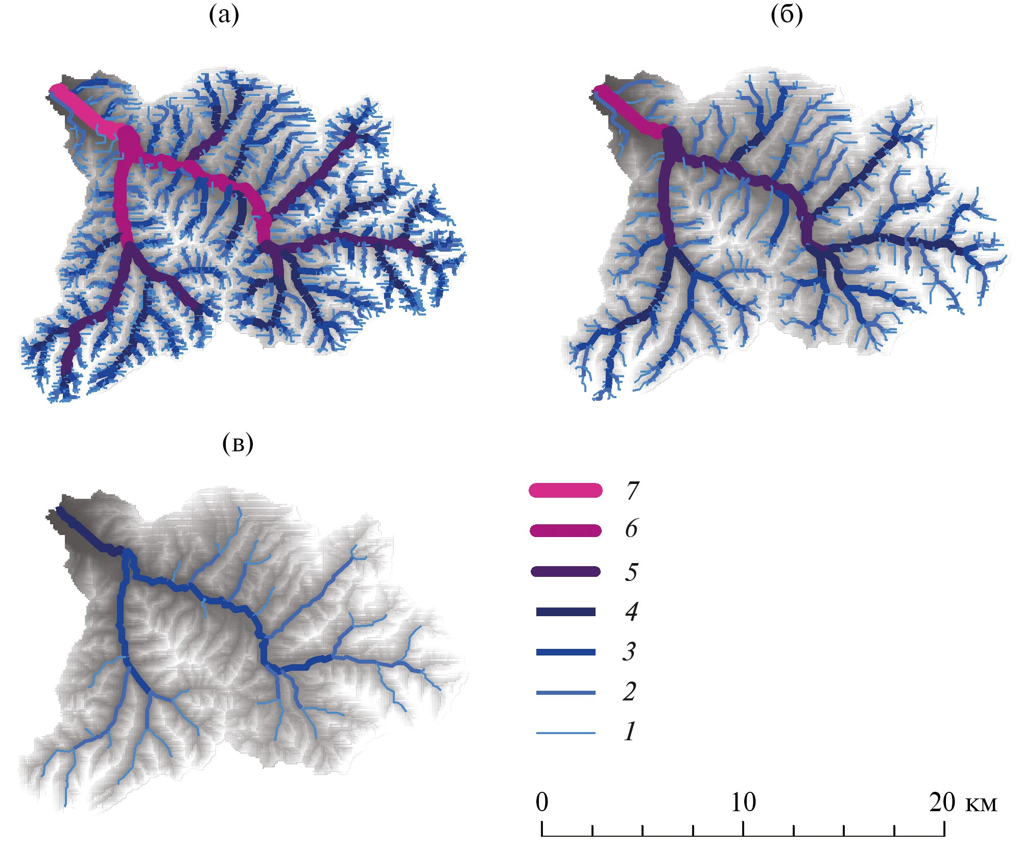 Рис. 3. Результаты расчета речной сети по CEI с использованием инструмента “Stream Network Orders”, пороговые значения: а – 5000, б – 20 000, в – 35 000. С 7 по 1 – порядок водотоков