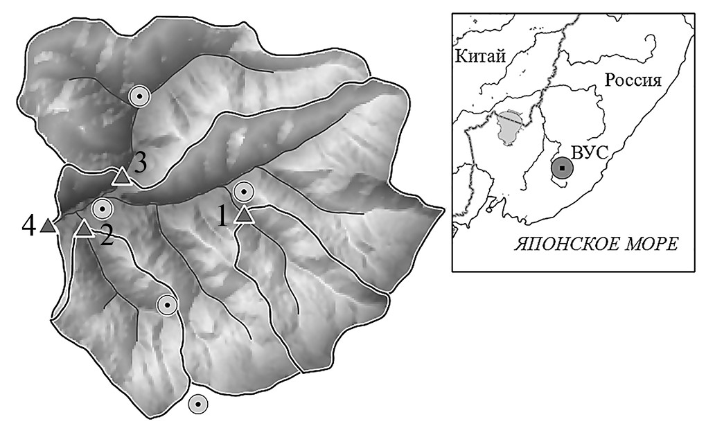 Рис. 1. Картосхема района исследования – территория Верхнеуссурийского стационара (ВУС), треугольниками показаны замыкающие створы: 1 – Березовый, 2 – Еловый, 3 – Медвежий, 4 – Правая Соколовка, круглыми значками – осадкомеры и метеостанции