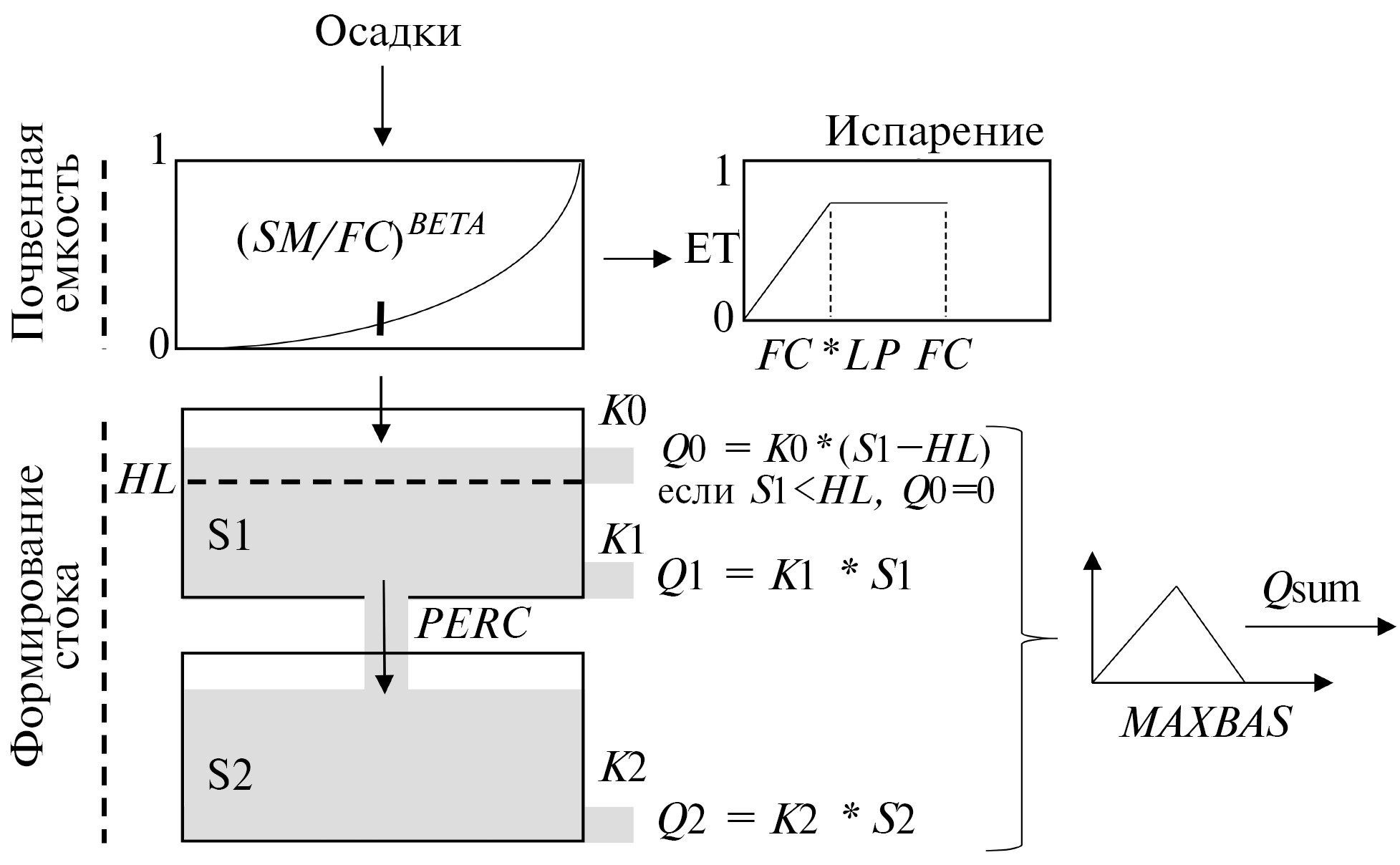 Для расчета формирования стока используется схема с верхней S1 и нижней S2 емкостями. Пополнение S1 (Recharge) зависит от отношения текущего влагосодержания SM (мм), максимального значения FC (мм) и коэффициента BETA: (SM(t)/FC)BETA; пополнение S2 определяется максимальной скоростью просачивания PERC (мм) из емкости S1. Рассчитывается три вида оттоков из стокоформирующих емкостей – Q0, Q1 и Q2, которые обычно интерпретируются как поверхностный, внутрипочвенный и грунтовый соответственно. Для описания каждого компонента стока используется линейное уравнение вида Qn(t) = Kn S(t), где Qn – отток из соответствующей емкости (S1 или S2), Kn – коэффициент рецессии, S(t) – текущий влагозапас емкости (мм). Формирование Q0 возможно только при достижении порогового значения HL (мм) верхней емкости S1. Сумма всех компонентов стока (Q0, Q1 и Q2) на каждый расчетный шаг преобразуется в гидрограф в замыкающем створе с помощью треугольной трансформационной функции с основанием MAXBAS (≥1), выраженным в единицах расчетного шага модели [35].