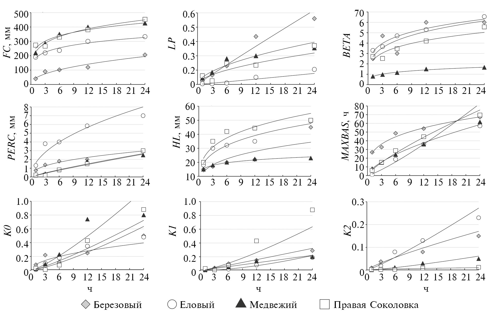 Полученные зависимости могут нарушаться для малых водосборов, что в целом соответствует результатам предыдущих исследований, в которых на основе химического анализа и гидрологического моделирования достоверно показано, что для расположенных рядом объектов исследования процессы формирования стока не являются гидрологически подобными, и параметры различных моделей не могут переноситься по принципам географической близости на соседние водосборы [10, 18]. Например, значения параметра FC, по смыслу близкого к полевой влагоемкости почвы, полученные для водосборов руч. Медвежьего и р. Правая Соколовка, достаточно близки и находятся в диапазоне 220–450 мм, для руч. Елового – 190–330 мм, что может быть сравнимо с имеющимися данными о влагоемкостных характеристиках почв [1]. Для руч. Березового значения FC заметно ниже (40–206 мм), что объясняется различиями характеристик подстилающей поверхности водосбора [10, 18].