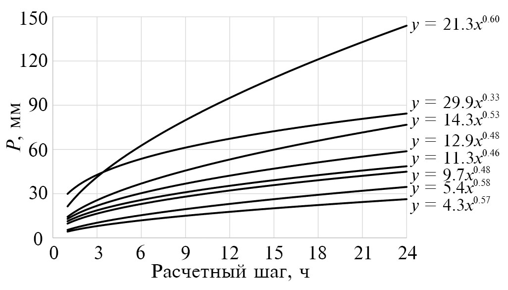 Рис. 6. Обобщенные зависимости максимальных измеренных сумм осадков P от временного шага для дождей ≥20 мм/сут