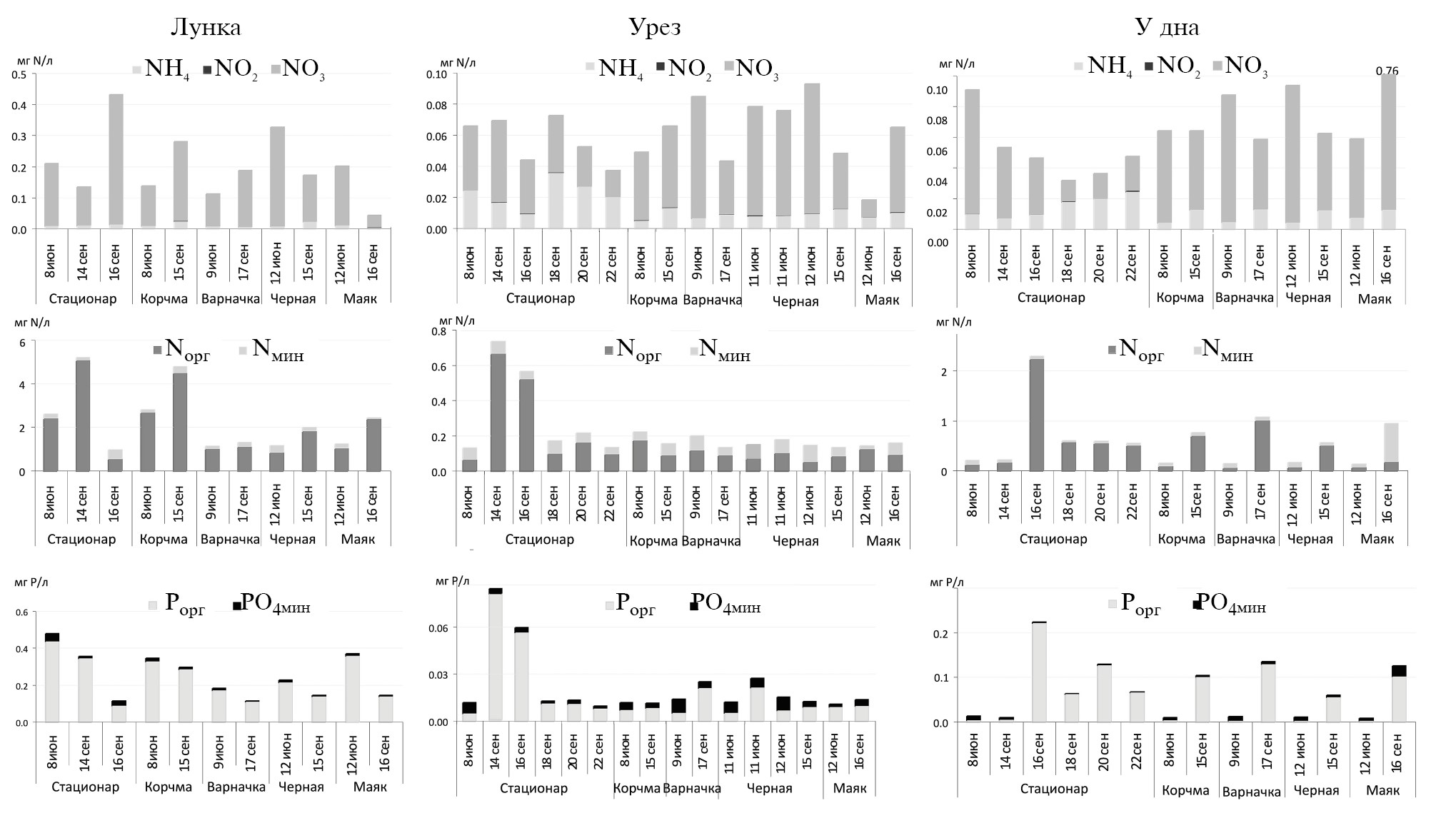 Отмеченное в сентябре 2022 г. на ст. “Стационар” низкое содержание кислорода в интерстициальной воде, вероятно, связано с расходом его на деструкцию органического вещества (водоросли, листья), выбрасываемого штормами на берег в этом районе. С разложением органического вещества чаще всего связаны и высокие концентрации соединений азота и фосфора в интерстициальной воде. Так как концентрации минеральных форм азота и фосфора и общее их содержание в придонной воде выше, чем в приурезовой воде, то можно предположить, что причиной может быть как разложение органических веществ, захороненных на дне между камнями, так и субаквальная разгрузка грунтовых вод с высокой концентрацией этих компонентов.