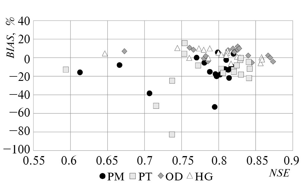 Значения NSE и BIAS, полученные в результате калибровки для 18 водосборов (табл. 3), образуют облако точек в области BIAS ±20% и NSE > 0.75 (рис. 5). Все точки со значительными отклонениями средних значений оценок эффективности (10 точек, 14% от общего количества) – Раковский (PM, PT, OD, HG), Пионерский (PM, PT), Мостовой (PM, PT) и Дубининский (PM, PT) (рис. 4) соответствуют водосборам, расположенным в бассейне р. Раковки. Данное обстоятельство может быть связано с расположением метеостанций, данные которых использованы для расчета PET. Водосборы, для которых получены высокие оценки качества моделирования, расположены в бассейне р. Комаровки; соответственно, метеостанция Приморская, данные которой использованы для расчета PET, расположена практически в центре этого водосбора (рис. 1). Метеостанция Тимирязевский, по данным которой был сделан расчет PET, находится достаточно далеко за пределами перечисленных выше водосборов с пониженными оценками эффективности моделирования.