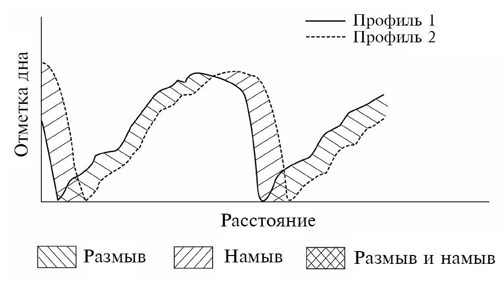 Этот метод [21] разработан, чтобы избежать необходимости работы с отдельными грядами и их характеристиками. Основное преимущество метода заключается в том, что он может быть применен к участкам дна, где часть гряд не может быть четко идентифицирована. На совмещенных эхограммах авторы выделяют области размыва, аккумуляции и области, испытывающие за время между съемками и размыв, и аккумуляцию (рис. 1). Предлагается разбить продольники на малые участки с одинаковой дискретностью и рассчитывать объем переместившихся наносов на каждом шаге. При этом объем наносов в каждой точке на поверхности гряды принимается разным. В точке пересечения эхограмм вблизи гребня гряды он принимается наибольшим и равным величине эрозии на напорном склоне гряды и одновременно величине аккумуляции на тыловом склоне этой гряды, произошедших за время между съемками. В точке выше по течению он принимается меньшим на величину объема эрозии между нею и первой точкой и т. д. В точке ниже по течению он также принимается меньшим на величину объема аккумуляции между нею и первой точкой и т. д. В областях, в которых зона аккумуляции выше по течению перекрывается зоной эрозии ниже по течению, объем наносов в каждой точке принимается равным сумме оставшегося объема аккумуляции ниже по течению и доли объема эрозии выше по течению от этой точки. Итоговый РДН рассчитывается как среднее арифметическое частных объемов переместившихся наносов, деленное на время между съемками. Согласно авторам, этот метод дает результаты, сопоставимые с их вторым методом [21]. Тем не менее представляется, что дискретизация транспорта наносов при их структурном движении, не учитывающая целостность донных форм, не отвечает физической сути процесса, поэтому этот метод кажется ошибочным.