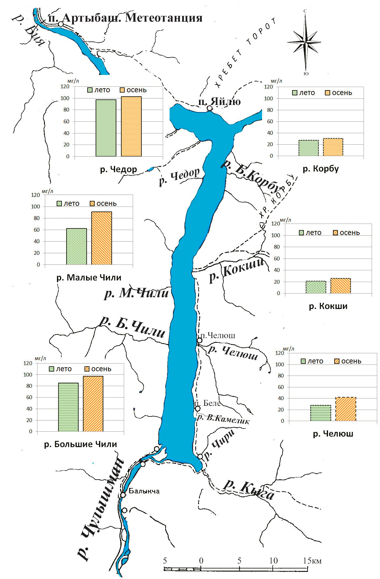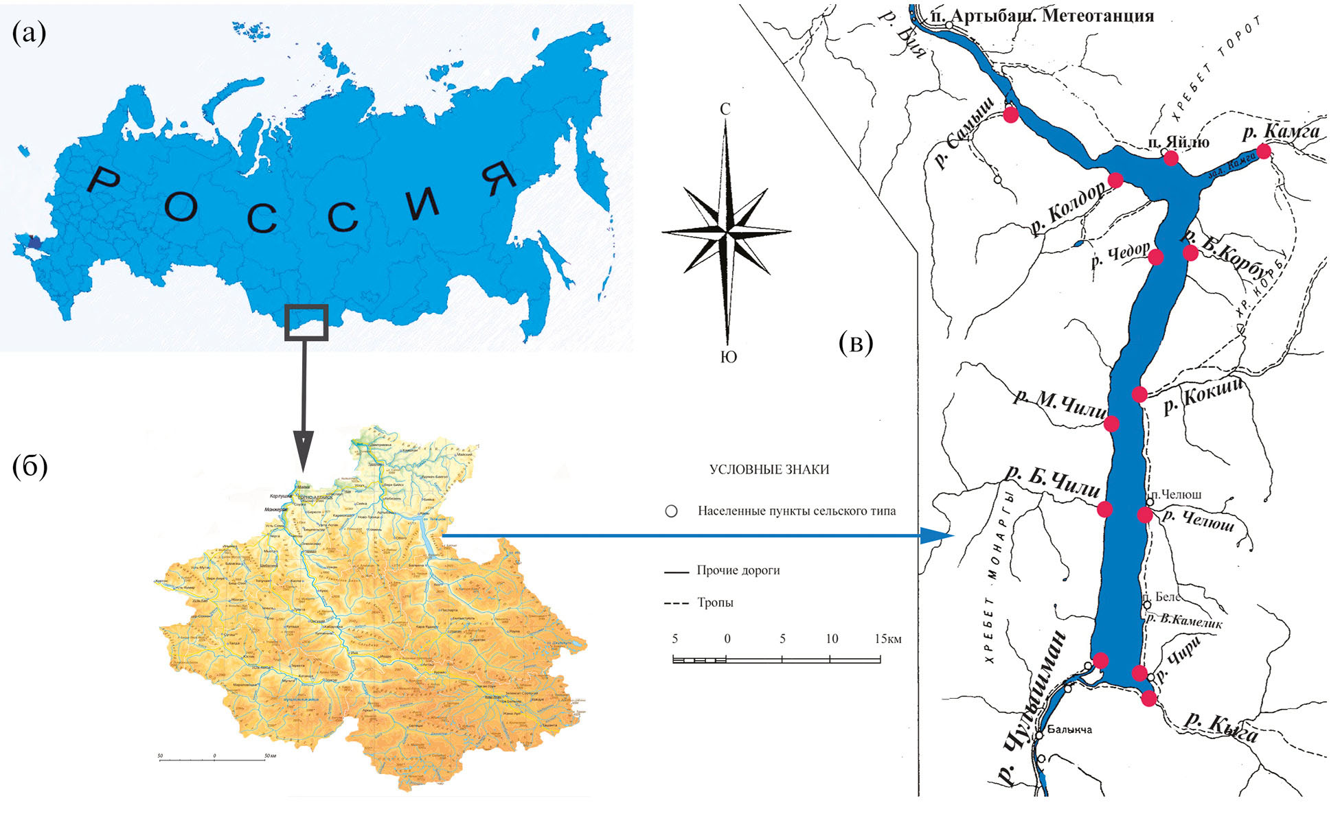 Объектами исследования были реки Чулышман – наиболее крупный приток озера, Камга – правый крупный приток широтной части озера, Кыга – крупный приток южной части озера. В широтной (северной) части озера исследованы реки Колдор и Самыш, в меридиональной части на западном берегу – реки Большие Чили и Малые Чили, а также малая р. Чедор, на восточном – крупная р. Кокши, малые реки – Корбу и Челюш, руч. Верхний Камелик, протекающий через маленький пос. Беле. Некоторые реки в устьевой части образуют конусы выноса и сразу за береговой полосой заболочены (Чулышман, Кыга, Камга, Колдор, Самыш), другие практически не имеют долин, впадают в озеро водопадом (р. Корбу). В самом озере пробы воды отбирались в его северной (широтной) части у пос. Яйлю. Картосхема расположения рек, в которых регулярно отбирались пробы воды, приведена на рис. 1.
