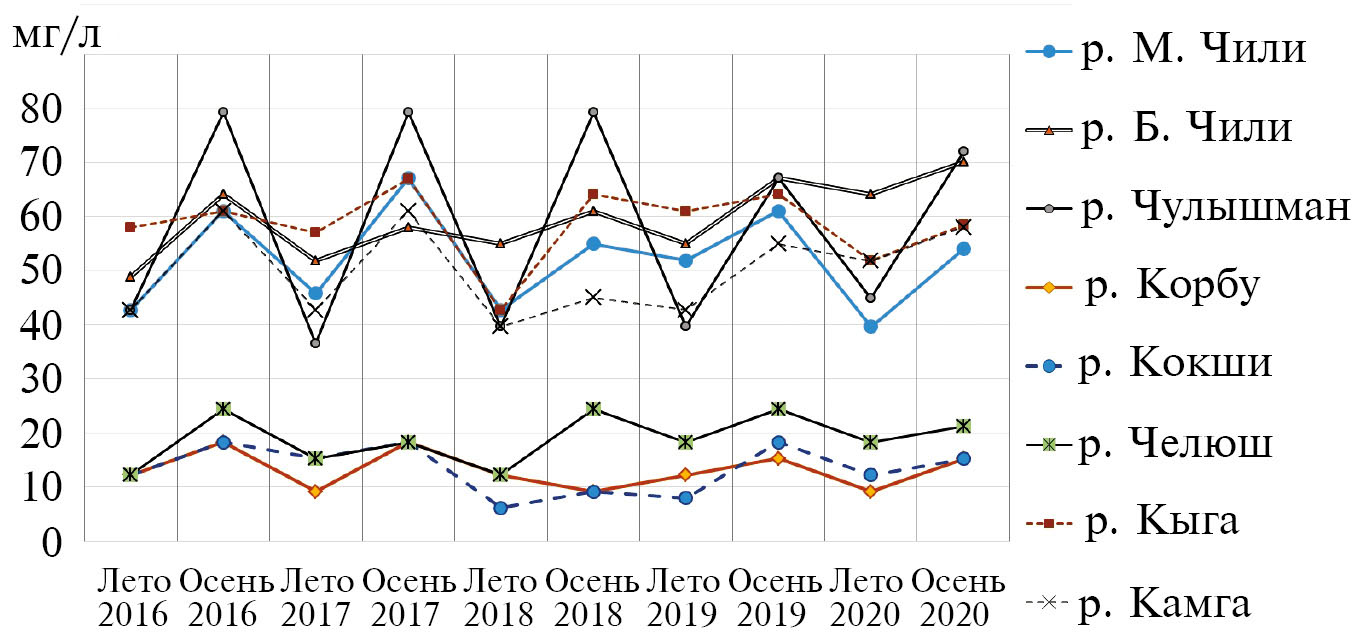 Содержание сульфатов в водах притоков оз. Телецкого относительно невысокое и за весь изученный период ≤13.5 мг/л. Наиболее высокое содержание сульфатов обнаружено в водах руч. В. Камелик – от 9.7 до 12.5 мг/л (12.3–15.7 %-экв.), что объясняется присутствием в горных породах на территории бассейна сульфидов в зоне контакта гранитов и метаморфических сланцев [12] и возможностями их дальнейшего окисления. Высокое содержание сульфатов обнаружено также в водах рек Чедор и Колдор. В течение года содержание сульфатов в водах большинства притоков оз. Телецкого существенно не меняется, за исключением р. Чулышман, содержание сульфатов в которой от лета к осени обычно возрастает в 1.5–2.0 раза. Некоторый рост содержания сульфатов отмечен в последние годы в водах рек Корбу и Кокши – до 7.3 осенью 2018 г. в р. Корбу и до 9.1 мг/л осенью 2019 г. в р. Кокши. Есть мнение, что в тех реках, где сульфаты имеют “неконсервативное” происхождение, повышение их концентрации на 5–7 мг/л в период открытого русла реки свидетельствует о снижении интенсивности аэробной биогеохимической трансформации [21].