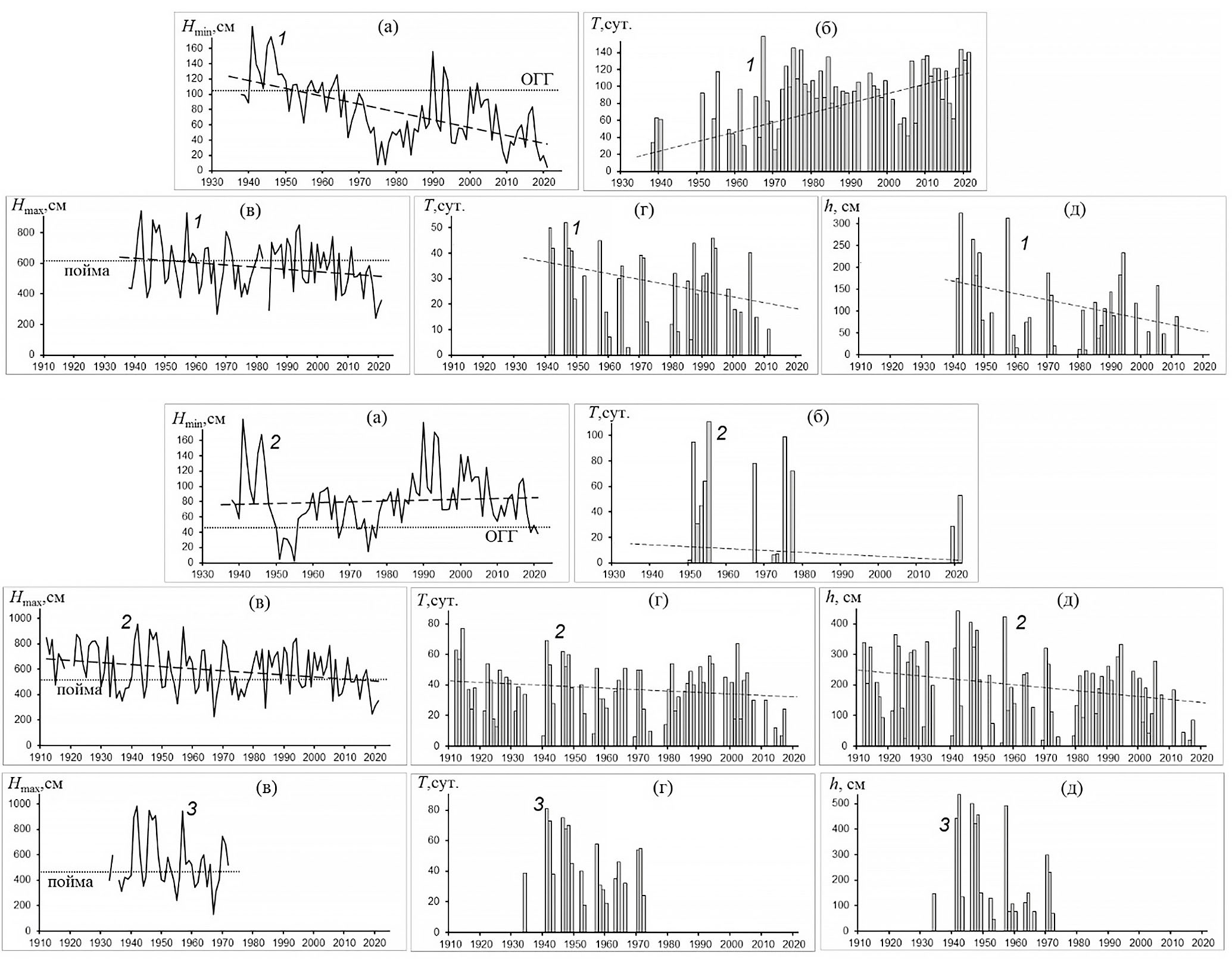 Рис. 3. Многолетние изменения минимального (за навигационный сезон) уровня воды (а), продолжительности стояния уровня ниже отметки гарантированных глубин в навигационный сезон (б, ОГГ), максимального уровня (в), продолжительности (г) и глубины (д) затопления поймы р. Урал на постах Уральск (1), Кушум (2) и Тополи (3) (с 1933 по 1974 г.) с линейными трендами.