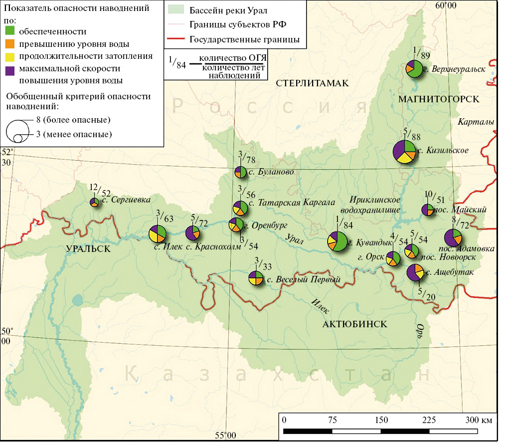 Наиболее опасные наводнения с обобщенным критерием 8 отмечались на посту р. Урал – с. Кизильское при повторяемости ОГЯ 5.7% (5 наводнений за 88 лет), причем самые опасные наводнения выявлены по максимальной скорости повышения уровня воды в период затопления. Обобщенный критерий опасности наводнений на посту варьирует от 7 до 9. Самое опасное наводнение с показателем 9 наблюдалось в 1946 г., по показателю максимальной скорости повышения уровня воды (2.65 м/сут) оно было отнесено к чрезвычайно опасным. На данном посту фиксируется наибольшая продолжительность стояния уровня воды выше отметки ОГЯ – до 9 сут в 1947 г. Повышение уровня воды в период паводка послужило причиной наводнения на посту в 2013 г. Тогда уровень воды держался ≤ 2 сут. Причиной остальных наводнений было повышение уровня воды в весенний период.
