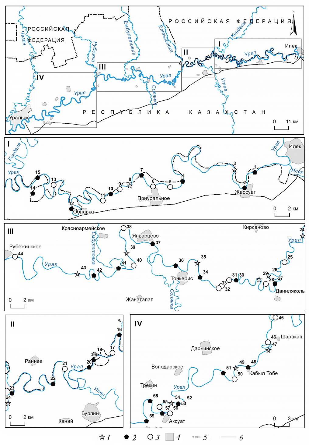 Рис. 1. Картосхема района исследования участка среднего течения р. Урал от с. Илек до г. Уральска. Категории нерестилищ: 1 – высшая, 2 – первая, 3 – вторая; 4 – населенные пункты; 5 – Государственная граница; 6 – автомобильная дорога Оренбург-Уральск. Участки: I. Илекско-Кинделинский; II. Кинделинско-Кирсановский; III. Кирсановско-Рубежинский; IV. Рубежинско-Уральский. Числами на карте обозначены нерестилища: 1. Нижнеилекское. 2. Жарсуатское. 3. Нижнежарсуатское. 4. Теренсайское. 5. Мельниковское, 6. Приуральное. 7. Нижнеприуральное. 8. Верхнекушкарское. 9. Среднекушкарское. 10. Нижнекушкарское. 11. Верхнедуванное. 12. Облавское. 13. Буренинское. 14. Жеребшанское. 15. Бородинское. 16. Усть-Кинделинское. 17. Старицкое, 18. Целиковское. 19. Среднеиртекское русловое. 20. Нижнебелогорское. 21. Усть-Иртекское. 22. Ранневское. 23. Нижнебатраковское. 24. Верхнекирсановское. 25. Нижнесудачное. 26. Сагитовское. 27. Новоутвинское. 28. Данилякульское. 29. Жереховское. 30. Цепное. 31. Усть-Кирсановское. 32. Елтышевское. 33. Верхнеалебастровское. 34. Алебастровское. 35. Нижнеалебастровское. 36. Долинское. 37. Январцевское. 38. Комбавское. 39. Перекрещенское. 40. Синий рынок. 41. Бурянинское. 42. Дубяковское. 43. Аксайское. 44. Верхнерубежинское. 45. Рубежинское, 46. Мордовье. 47. Сауркино. 48. Красношкольное. 49. Окунишниково. 50. Кумысное. 51. Верхнешумихинское. 52. Сазанье. 53. Карабекское. 54. Среднетравное. 55. Куринское. 56. Аксуатское, 57. Верхнезолотое. 58. Верхнетрекинское. 59. Верхнежелезнодорожное.
