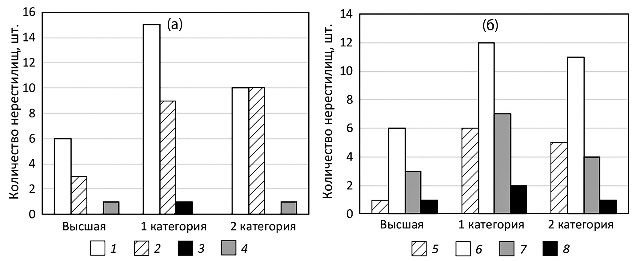 Рис. 4. Современное состояние осетровых нерестилищ. а – факторы антропогенного воздействия: 1 – доступное (имеется транспортный подъезд, подход для водопоя скота, рекреация, наличие рыбацких станов); 2 – не выявлено; 3 – добыча песчано-гравийной смеси; 4 – наличие водозабора. б – степень сохранности нерестилищ по сравнению с 1982 г.: 5 – ненарушенные; 6 – частичное зарастание, заиление, закаршованность; 7 – полное зарастание и/или изменение русла; 8 – утраченное.