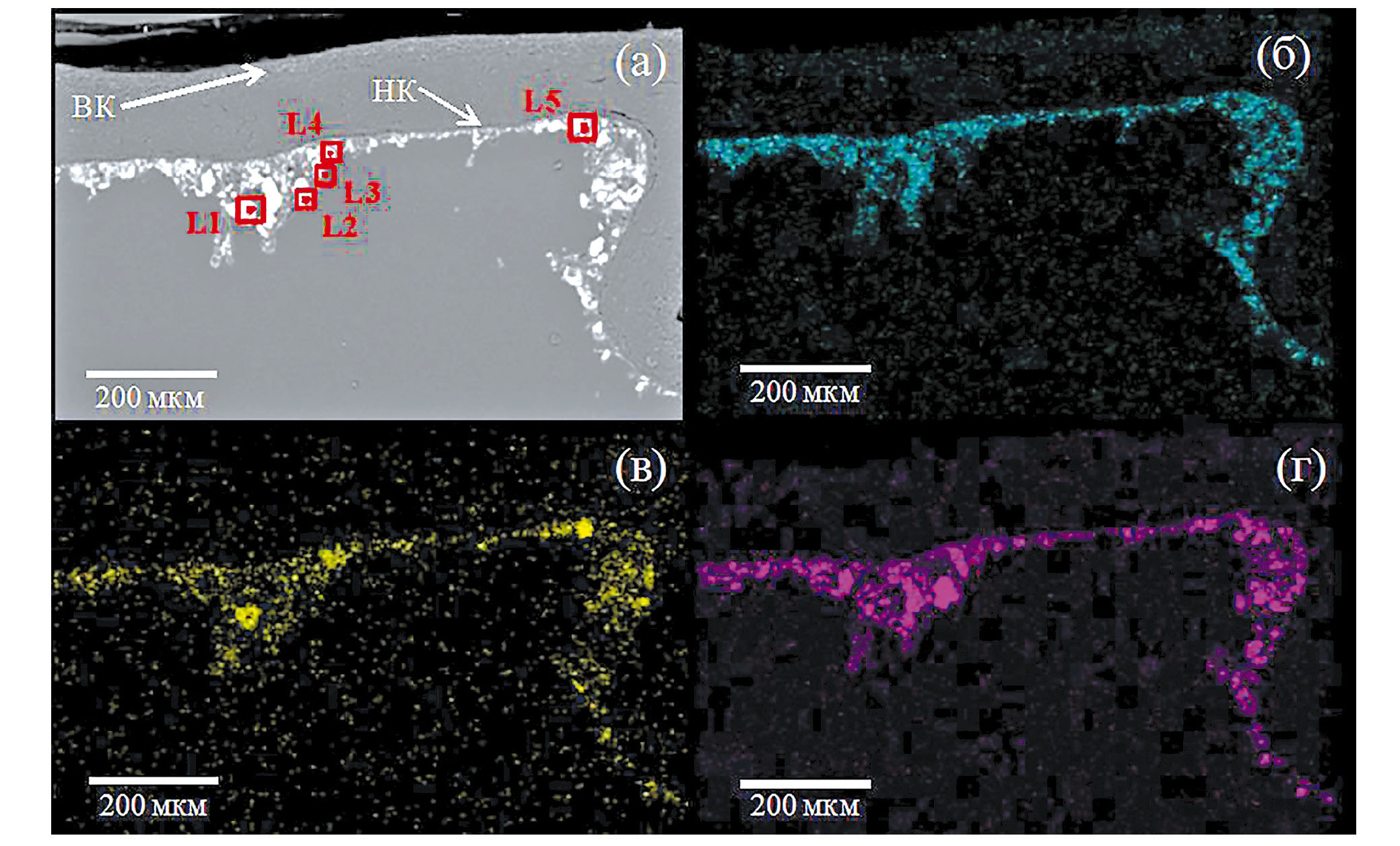Рис. 1. Изображение поперечного среза таллома Lobaria pulmonaria, полученное в режиме детектирования обратно рассеянных электронов (а) и карты распределения элементов: б – Al, в – Fe, г – Si. Областям с яркой окраской соответствует максимальное содержание элемента; ВК – верхний коровый слой, НК – нижний коровый слой; элементный состав минеральных частиц (L1–L5) приведен в табл. 2.