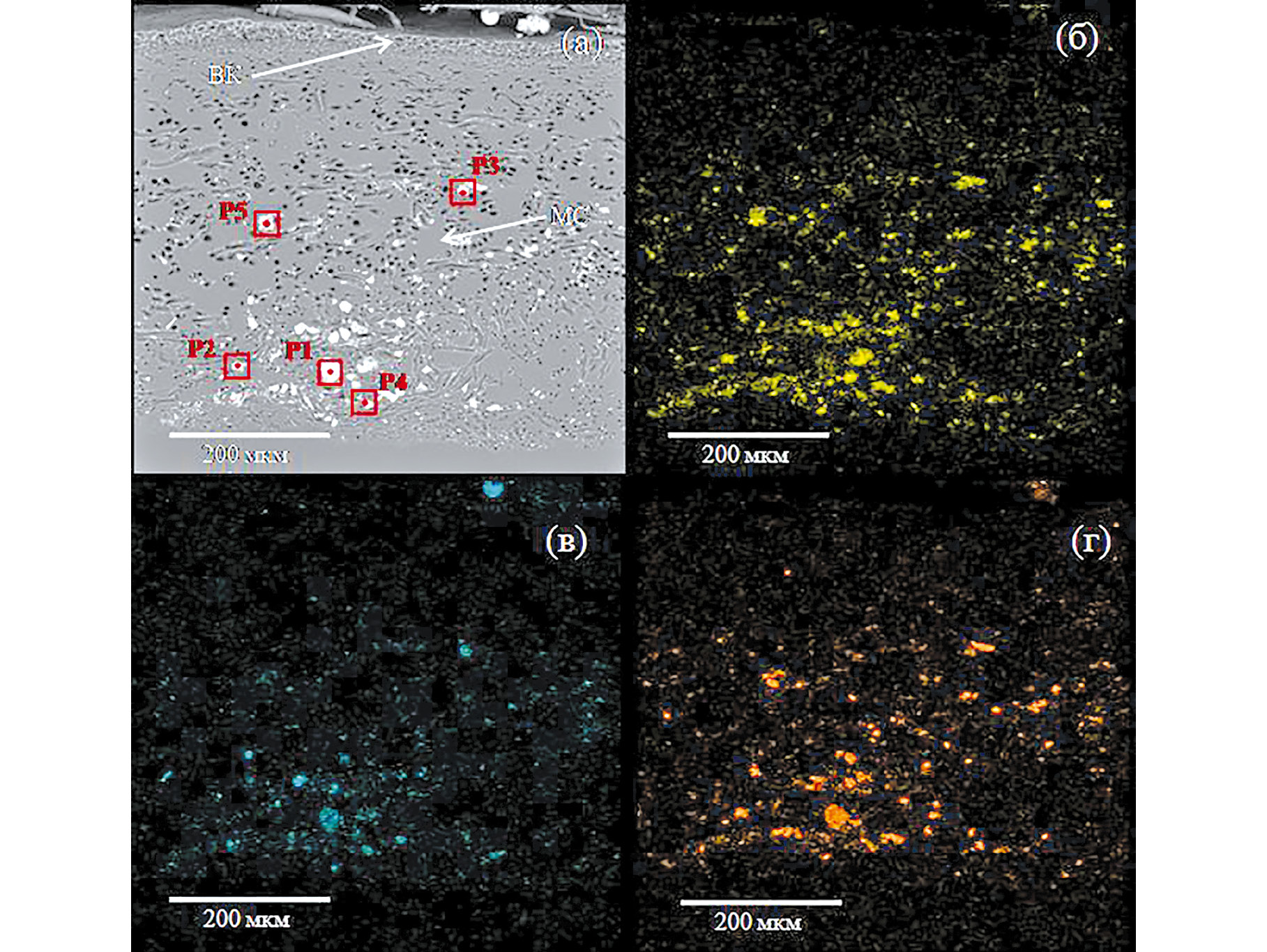 Рис. 2. Изображение поперечного среза таллома Peltigera aphthosa, полученное в режиме детектирования обратно рассеянных электронов (а) и карты распределения элементов: б – Al, в – Fe, г – Si. Областям с яркой окраской соответствует максимальное содержание элемента; ВК – верхний коровый слой, МС – медуллярный слой; элементный состав минеральных частиц (P1–P5) приведен в табл. 2.