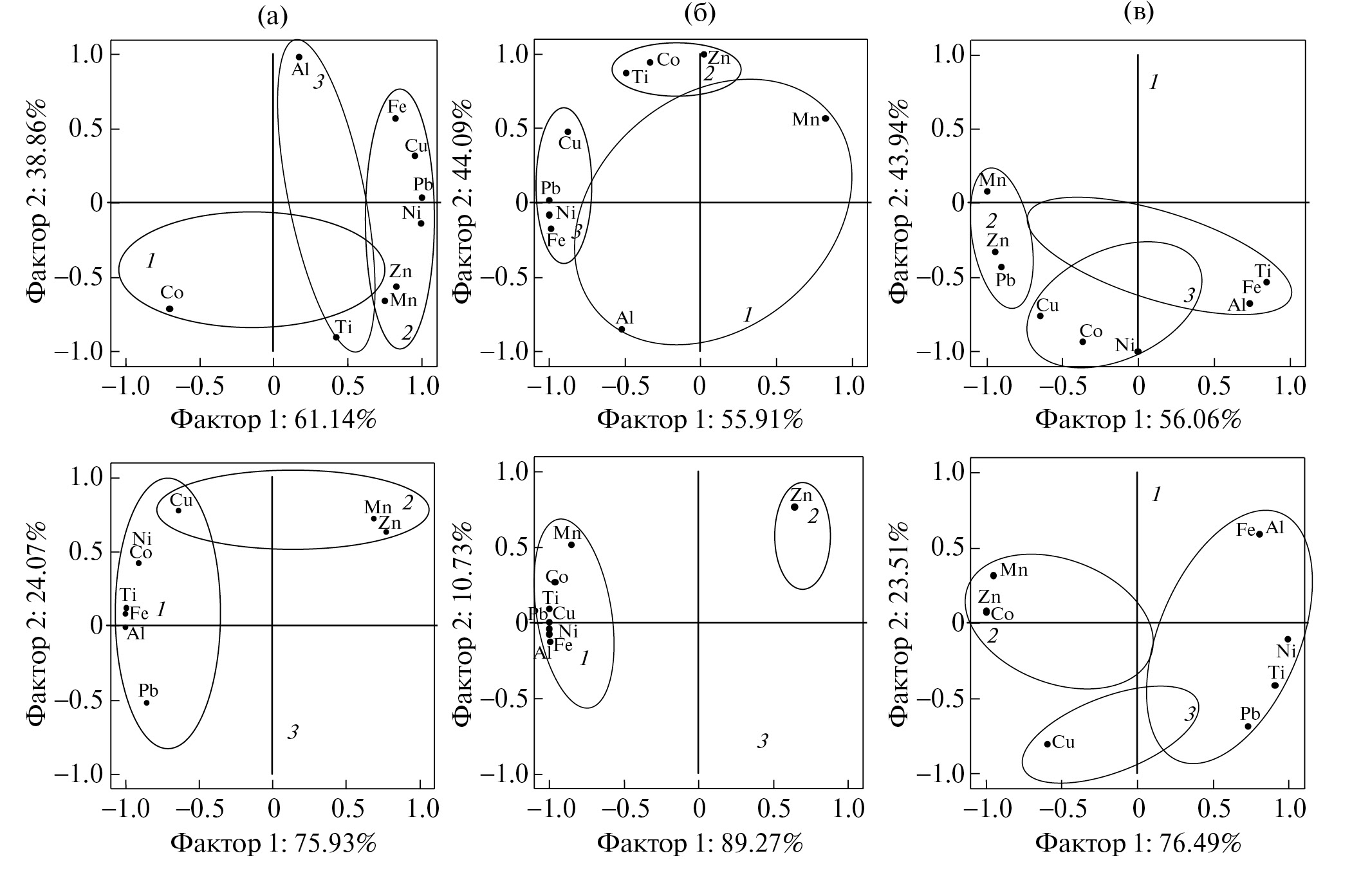 Рис. 3. Анализ главных компонент распределения относительной доли металлов в разных фракциях из талломов лишайников Hypogymnia physodes (а), Lobaria pulmonaria (б) и Peltigera aphthosa (в): cверху представлены результаты для талломов из условно-фоновой территории, снизу – для отобранных в импактной зоне. Сплошной линией объединены металлы, вносящие основную нагрузку в Фактор 1 (горизонтальная ось) и/или Фактор 2 (вертикальная ось); 1, 2 и 3 – пылевая, ЭДТА-Na2-экстрагируемая и остаточная фракции металлов соответственно.