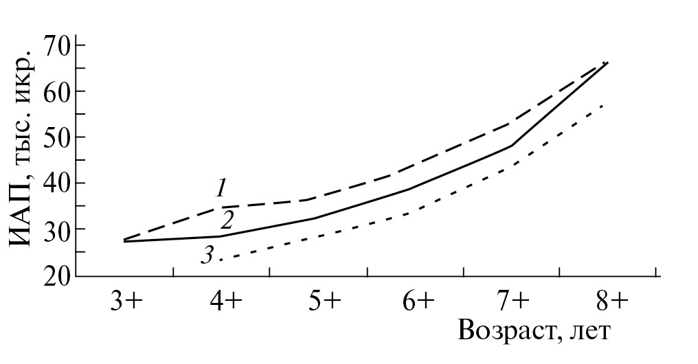 Рис. 5. Усредненная абсолютная индивидуальная плодовитость (ИАП) пеляди в разные по водности годы: 1 – многоводные, 2 – в среднем за годы наблюдений, 3 – маловодные.