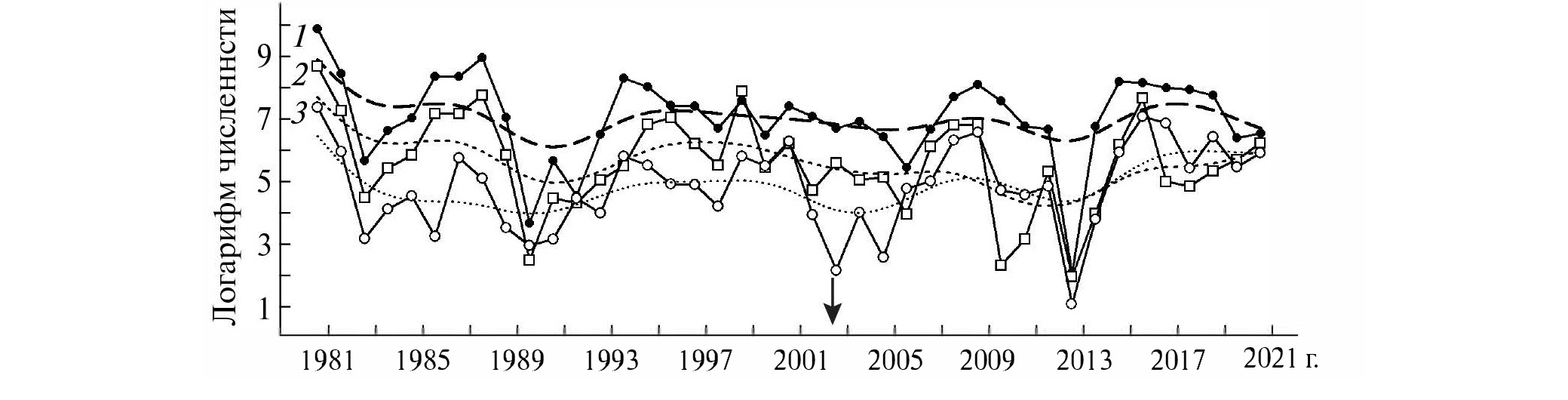 Рис. 6. Динамика численности покатных личинок пеляди (логарифм численности) на реках Северная Сосьва (1), Сыня (2) и Войкар (3). Штриховые линии – соответствующее локальное сглаживание (Lowess).