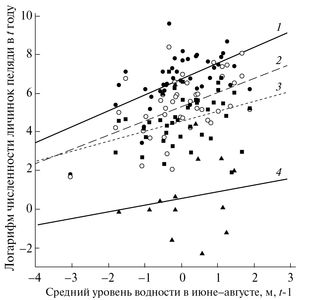 На основе полученных многолетних данных было построено уравнение натурального логарифма численности особей в генерациях пеляди Нижней Оби от среднего (июнь – август) уровня затопления поймы реки Оби (ГП Салехард) в предшествующем (t-1) году: y = 1.42x + 1.30 при R2 = 0.71 (рис. 10). При наличии связи численности особей в генерациях пеляди с динамикой уровня и продолжительности затопления низкой поймы Оби появляется возможность прогнозировать численность популяции. В обобщенном виде цепь событий, приводящих к появлению высокочисленных генераций пеляди, следующая: высокое и длительное стояние воды в пойме за год до нереста и в год нереста – повышение темпа весового роста – повышение популяционной плодовитости – размножение на верхних нерестилищах – повышенное выживание икры – появление многочисленного потомства.