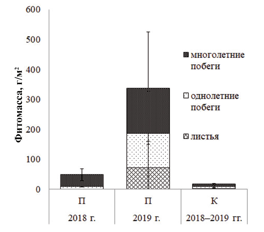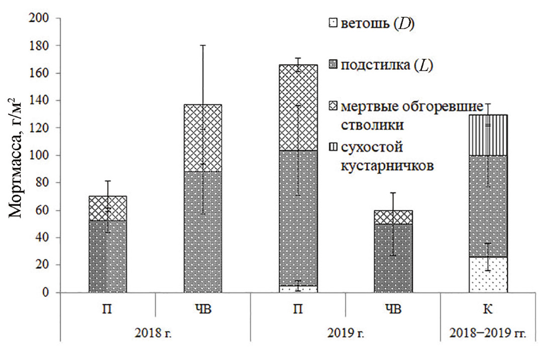 Структура мортмассы – одна из важных характеристик функционирования экосистемы. На участке П отсутствует фракция ветоши из-за незначительного участия травяной растительности на первых этапах сукцессии (рис. 1). Но фракция подстилки достаточно высока (53 г/м2) и в ней присутствуют обгоревшие и упавшие стволики кустарничков – опад (18 г/м2). Запасы обгоревших многолетних побегов (49 г/м2) увеличиваются на третий год восстановления в связи с дополнительным опадом обугленных ветвей сосен (88 г/м2). На участке ЧВ, напротив, со временем существенно снижается запас обгоревших побегов – с 99 до 50 г/м2. В контроле состав надземной мортмассы отличается наличием фракции сухостоя кустарничков (30 г/м2), ветоши/опада (26 г/м2), остается высоким запас подстилки (74 г/м2).