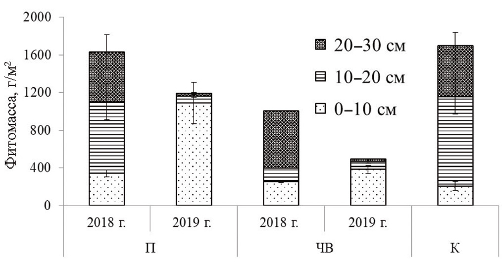 Надземная фитомасса и мортмасса. Пожар 2016 г. привел к выгоранию растительного покрова и изменению структуры растительного вещества на изучаемом участке Бакчарского болота. Структура надземной фитомассы в 2018 г. различалась на изучаемых площадках: на участке П преобладают кустарнички в отличие от участков ЧВ и К, где преобладают живые мхи (табл. 2). Более того, запас кустарничков на наиболее нарушенном пожаром участке П в 2.5 раза превышает таковой в контроле и возрастает с течением времени, в то время как на менее нарушенном участке снижается. Запас трав минимален на всех участках и возрастает от наиболее нарушенного участка к контролю. Фитомасса мхов на участке с максимальной пирогенной нагрузкой (П) составляет 30% от контроля. Изменяется и видовой состав этой фракции: в контроле это сфагновые мхи, а на поврежденном пожаром участке – зеленые мхи, не играющие эдификаторную роль. Характерно, что в местах, где поселяется Polytrichum strictum, в 2–3 раза снижается количество всасывающих корней сосудистых растений. Общий запас живой фитомассы сосудистых растений достаточно высок на обоих пирогенно нарушенных участках, но не достигает величины, характерной для контроля. Запас мортмассы увеличивается на третий год восстановительной сукцессии на участке П, превысив значение в контроле, а на частично поврежденном участке, напротив, снижается. Отношение фитомассы к мортмассе на участке ЧВ такое же, как в контроле, а на участке П выше контроля.