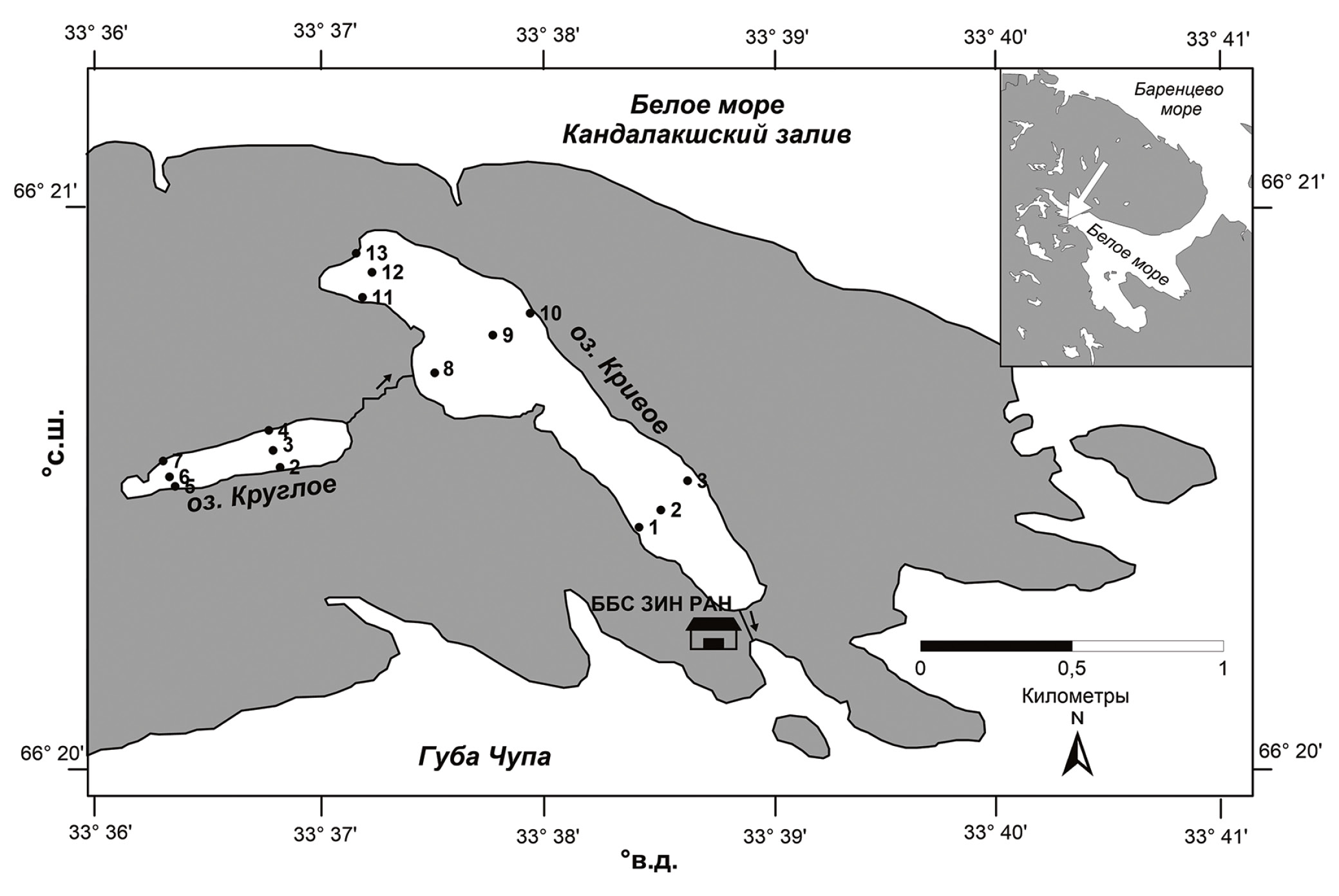Из обитателей водоемов макрозообентос считается наиболее эффективным индикатором долговременных изменений природной среды, поскольку по сравнению с планктоном организмы макрозообентоса имеют более длительный жизненный цикл, вследствие чего они менее чувствительны к сезонным и синоптическим колебаниям [11]. Макрозообентос озер Кривое и Круглое, расположенных в Северной Карелии (рис. 1), был впервые исследован в рамках Международной биологической программы в 1968–1969 гг. [12]. Впоследствии исследования на обоих озерах были надолго прерваны. Только в середине 1990-х годов был изучен качественный состав и количественные характеристики личинок двукрылых литоральной зоны [13–15]. В 2002 г. были возобновлены регулярные наблюдения за состоянием донных сообществ на оз. Кривое. В ходе исследований установлено, что межгодовые колебания биомассы макрозообентоса в озере в значительной степени определяются погодными условиями в зимний период [16].