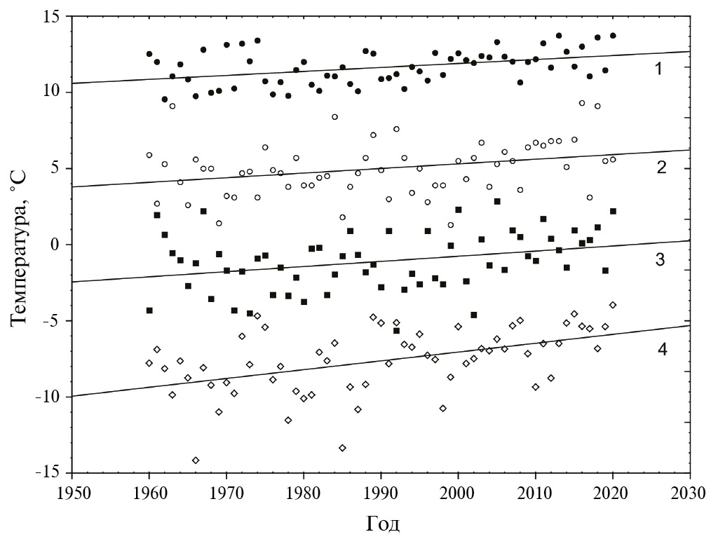 Рис. 2. Изменения средней температуры приземного воздуха в июне – сентябре (1), мае (2), октябре – ноябре (3) и декабре – апреле (4) на метеостанции Умба с 1960 г. по 2020 г. Параметры линейных трендов приведены в табл. 1