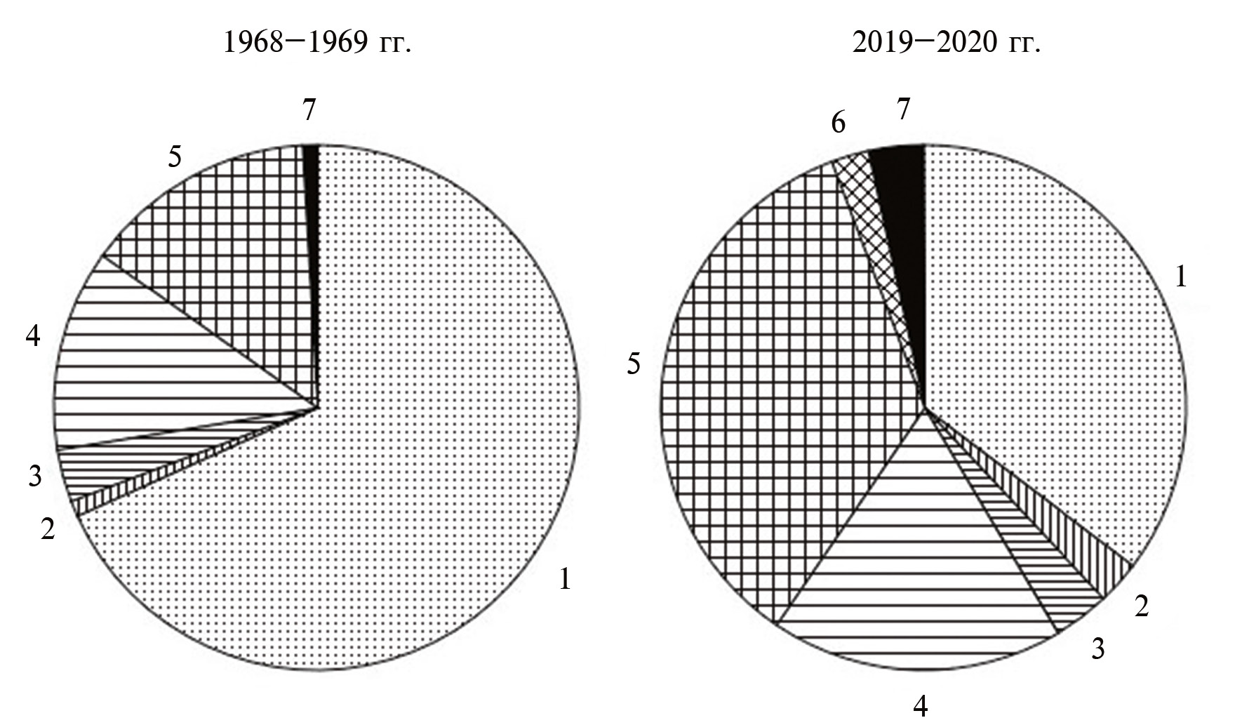 Рис. 4. Состав макрозообентоса оз. Круглое в 1968–1969 и 2019–2020 гг.: 1 – Bivalvia, 2 – Gastropoda, 3 – Megaloptera, 4 – Ephemeroptera, 5 – Chironomidae, 6 – Diptera (кроме Chironomidae), 7 – прочие