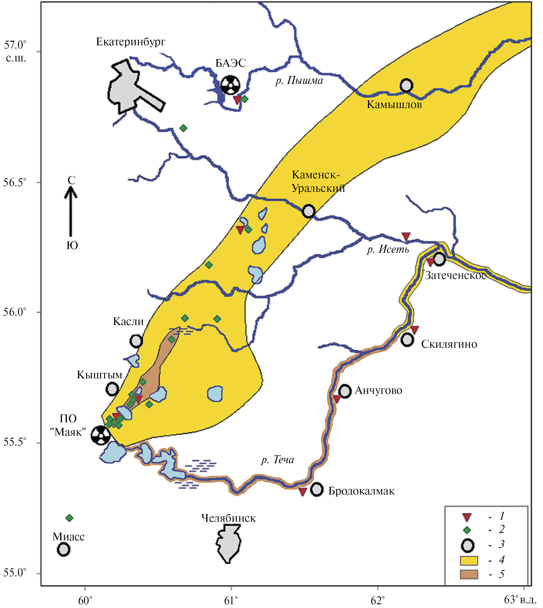 Восточно-Уральский радиоактивный след сформировался 29 сентября 1957 г. в результате взрыва емкости с радиоактивными отходами на ПО “Маяк”. Эта так называемая Кыштымская авария по международной шкале ядерных событий относится к 6-му уровню, уступая лишь авариям на АЭС в Чернобыле и Фукусиме, получившим статус 7-го уровня [18]. Общий выброс радионуклидов оценивался в 7.4×1017 Бк, из них около 10% поднялось в атмосферу и, выпадая из облака, загрязнило территорию площадью 23 000 км2 (см. рис. 1).