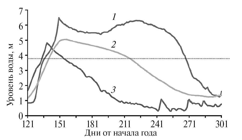 Рис. 2. Гидрографы суточных уровней воды в створе гидропоста Салехард для многоводного 1979 г. (1), маловодного 2012 г. (3) и многолетнего (2) среднего гидрографа (1934–2021 гг.). Горизонтальная пунктирная линия соответствует верхней границе нижнего экологического яруса поймы.